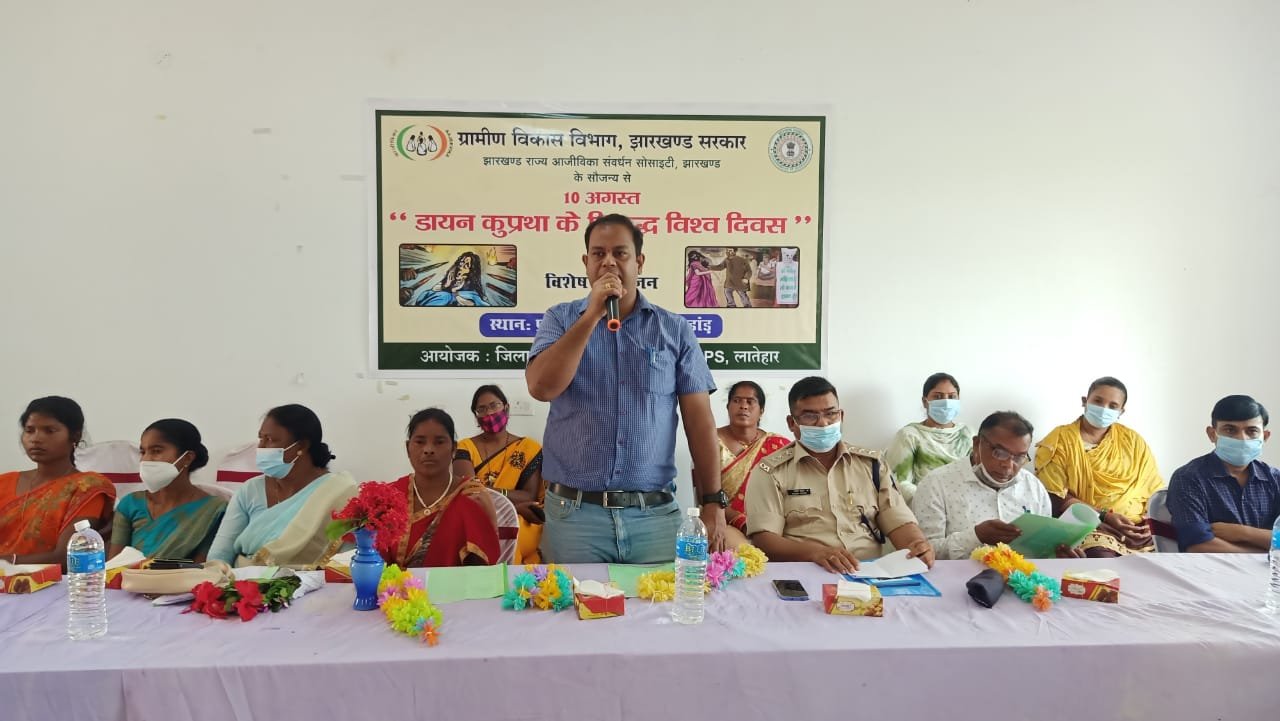 महुआडांड़ प्रखंड कार्यालय के सभागार में झारखंड राज्य आजिविका संवर्धन सोसाइटी झारखंड के सौजन्य से 10 अगस्त को डायन कुप्रथा के विरुद्ध विश्व दिवस के रूप में जिला मिशन मैनेजमेंट यूनिट जेएसएलपीएस लातेहार इकाई महुआडांड़ के द्वारा मंगलवार को कार्यक्रम का आयोजन किया गया। कार्यक्रम की शुरुआत सांसद प्रतिनिधि एस्तेला नगेसिया,जिला परिषद सदस्य मनिना कुजूर,मुखीया फ्रीदा कुजूर, सुषमा कुजुर,रेणु तिग्गा,सामाजिक सुरक्षा जिला मैनेजर जेएसएलपीएस रविकांत मिश्रा, पत्रकार तनवीर अहमद के द्वारा संयुक्त रूप से दीप प्रज्ज्वलित कर किया गया।डायन कुप्रथा को लेकर सबसे पहले समूह की दीदी तायबा खातुन के द्वारा विस्तृत रूप से जानकारी उपलब्ध कराई गई।चल रहे कार्यक्रम के दौरान अपना बहुमूल्य समय देकर कार्यक्रम को संबोधित करने एवं महिलाओं को प्रोत्साहित करने के लिए अनुमंडल पदाधिकारी नित निखिल सुरीन,डीएसपी राजेश कुजूर एवं प्रखंड विकास पदाधिकारी शंभू राम पहुंचे।जहां समुह की दीदीयों के द्वारा पुष्प गुच्छ भेंट कर स्वागत किया गया।आये हुए पदाधिकारियों के द्वारा बारी बारी से डायन कुप्रथा को खत्म करने के लिए अपना अपना सुझाव दिया।