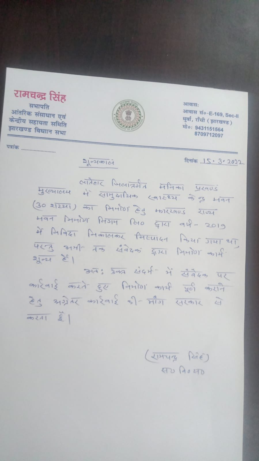 1, मनिका प्रखंड में 2019 ,से लम्बीत पड़ा योजना सामुदायिक स्वास्थ केन्द्र जो 30 बेड का है दो शाल बीत जाने के बाद भी संवेदक भवन तैयार नहीं किया जिसके लेकर विधायक ने सरकार के समक्ष जांच कर संवेदक के खिलाफ कारवाई की मांग किया ।