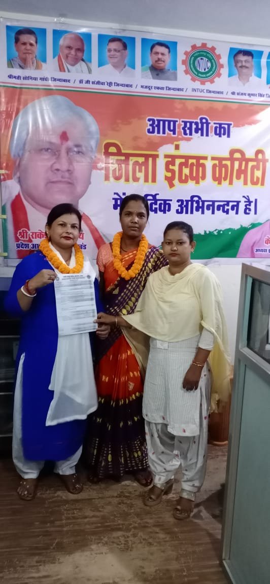 सरायकेला जिला इंटक के जिला अध्यक्ष श्री के पी तिवारी के द्वारा श्रीमती सुमित्रा पांडा जी को जिला सचिव के पद पर मनोनीत किया गया और उन्हें यह निर्देश दिया गया की सरायकेला जिला में कामगार महिलाओं को संगठन से जोड़ें। इस उपलक्ष में मुख्य रूप से कोल्हान इंटक प्रभारी श्री राणा सिंह जिला उपाध्यक्ष सुशील सिंह सुनील सिंह जिला महासचिव अशोक सिंह एवं रामविचार राय उपस्थित थे।