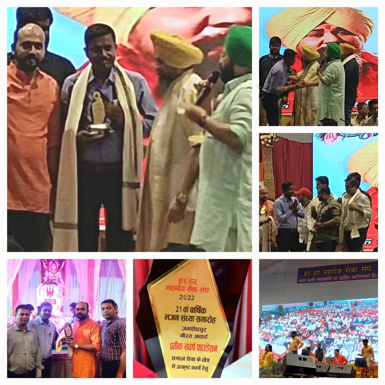 *”हर हर महादेव संघ ” के द्वारा, 21 वां वार्षिक भजन संध्या समारोह में, हजारों भक्तों के बीच समाज सेवा के क्षेत्र में उत्कृष्ट कार्य के लिए ” हर हर महादेव संघ ” के द्वारा ” प्रतीक संघर्ष फाउंडेशन ” को ” जमशेदपुर गौरव अवार्ड ” से, संरक्षक अमरप्रीत सिंह खनूजा ( काले सिंह ) , मशहूर भजन सम्राट लखबीर सिंह लक्खा जी, के गरिमामय उपस्थिति में, सम्मानित किया गया. प्रतीक संघर्ष फाउंडेशन के निर्देशक अरिजीत सरकार ने इसका श्रेय संस्था के सभी सदस्यों एवं संस्था के सभी शुभचिंतकों के नाम समर्पित करते हुए, हर हर महादेव संघ के संरक्षक अमरप्रीत सिंह खनूजा ( काले सिंह ) जी को तहे दिल से आभार प्रकट किया गया. आज प्रतीक संघर्ष फाउंडेशन अपने कर्म के बल पर शहर से लेकर सुदूरवर्ती गांव तक धरातल में रह रहे जरूरतमंद लोगों के लिए अपनी सेवाएं प्रदान करते हुए एक अलग पहचान बनाई है. आज इस अवसर पर प्रतीक संघर्ष फाउंडेशन के निर्देशक अरिजीत सरकार, कुमारेस हाजरा, रंजन प्रसाद एवं अनूप श्रीवास्तव. उपस्थित रहे