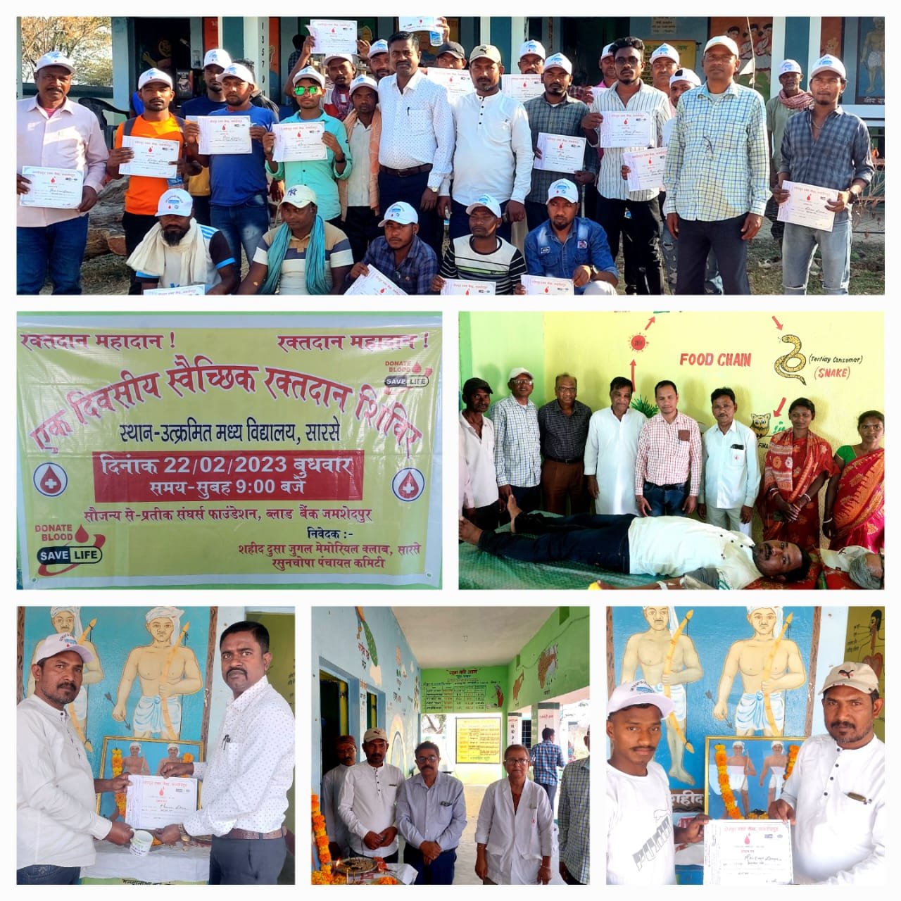 *आज दिनांक 22 फरवरी 2023, झारखंड माटी के लाल एवं स्वतंत्रता संग्रामी वीर शहीद सपूत ” दूसा युगल मेमोरियल क्लब ” के द्वारा एक दिवसीय स्वैच्छिक एवं सुरक्षित 🩸” रक्तदान शिविर ” का आयोजन सुदूरवर्ती गांव रसुनचोपा पंचायत के उत्क्रमित मध्य विद्यालय सारसे पोटका में आयोजित हुआ. निरंतर 7 वर्षों से वीर शहीद दूसा युगल मेमोरियल क्लब के द्वारा इतने सुदूरवर्ती गांव में 🩸रक्तदान के प्रति जागरूकता के साथ-साथ 🩸रक्तदान शिविर आयोजित कर, सही में इस गांव के वीर रक्त दाताओं ने दिया मानवता का परिचय. जहां 52 यूनिट 🩸रक्तदान के साथ वीर रक्त वीर योद्धाओं ने कई अंधेरा रुपी जीवन में दिया जलाने का कार्य किया. साथ ही साथ 🩸रक्तदान के प्रति जागरूकता का एक पैगाम भी समाज को प्रदान किया. इस 🩸रक्तदान शिविर के आयोजन करने में प्रतीक संघर्ष फाउंडेशन एवं जमशेदपुर ब्लड सेंटर निरंतर अपना सहयोग प्रदान करते हुए आ रहे हैं. और सबसे बड़े खुशी की बात यह है की, इतने सुंदर वातावरण में, परिवार जैसा प्यार, सभी गांव वाले मृदुभाषी, एक अलग छवि जगा रहा था. हर एक रक्तवीर योद्धा संस्था के सभी सदस्य एवं गांव वाले सभी, किसी फरिश्ते से कम नहीं थे. जहां गांव वाले हर दिन अपने कड़ी मेहनत के साथ अपने दिनचर्या को पार करते हैं. ऐसे सोच के साथ की निरंतर एक 🩸रक्तदान शिविर का आयोजन करना सही मायने में इन सभी को आज नमन करने का दिन है. इस 🩸रक्तदान शिविर के जरिए सिर्फ अपने गांव वालों को ही सुरक्षित करना इनका मकसद नहीं है, बल्कि जो इस वक्त अस्पताल में इलाजरत है, उसे भी सही समय पर 🩸रक्त मिल पाए वीर शहीद दूसा युगल क्लब ने हमेशा अपना कदम आगे बढ़ाया. आज इतने सफलतम आयोजन के लिए प्रतीक संघर्ष फाउंडेशन एवं जमशेदपुर ब्लड सेंटर वीर शहीद दूसा युगल क्लब के सभी सदस्य, अध्यक्ष, सचिव एवं सभी आयोजनकर्ता का ऐसे अतुलनीय कार्य के लिए तहे दिल से आभार प्रकट करते हुए हार्दिक बधाई