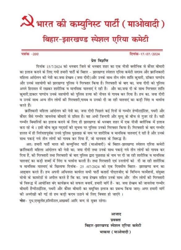 नक्सली संगठन भाकपा माओवादी ने 25 जुलाई को झारखंड और बिहार में बंद का आह्वान किया है। यह बंद नक्सली नेता कामरेड जया हेम्ब्रम समेत तीन नक्सलियों की गिरफ्तारी के विरोध में किया जा रहा है। नक्सली हर साल 28 जुलाई से 3 अगस्त तक शहीद सप्ताह मनाते हैं, जिसमें वे अपने मारे गए साथियों को श्रद्धांजलि देते हैं।