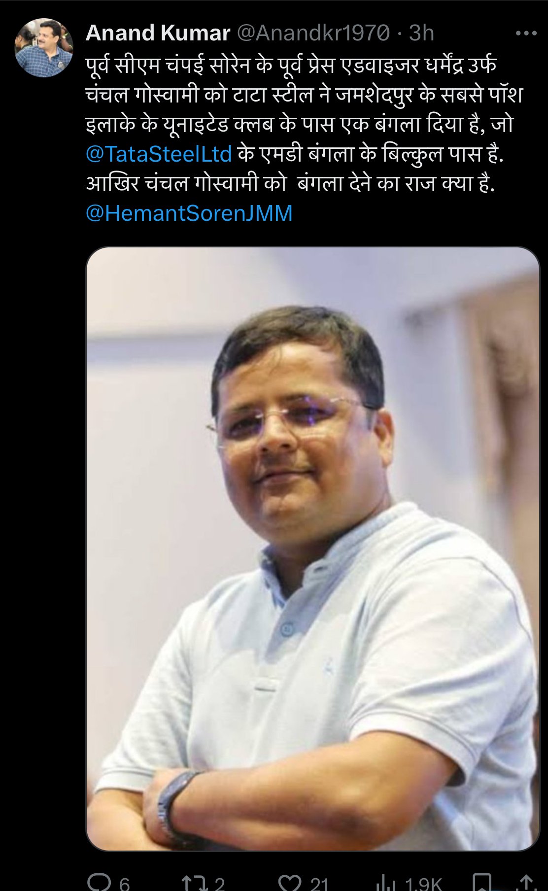 जमशेदपुर:जमशेदपुर के वरिष्ठ पत्रकार आनंद कुमार ने एक्स (पूर्व में ट्विटर) पर सवाल उठाते हुए लिखा, “आखिर ये चंचल गोस्वामी कौन हैं?” दरअसल, चंचल गोस्वामी झारखंड के पूर्व मुख्यमंत्री चंपई सोरेन के प्रेस सलाहकार रह चुके हैं। आनंद कुमार ने सवाल किया कि आखिर टाटा स्टील कैसे बंगले की सुविधा प्रदान कर सकती है?