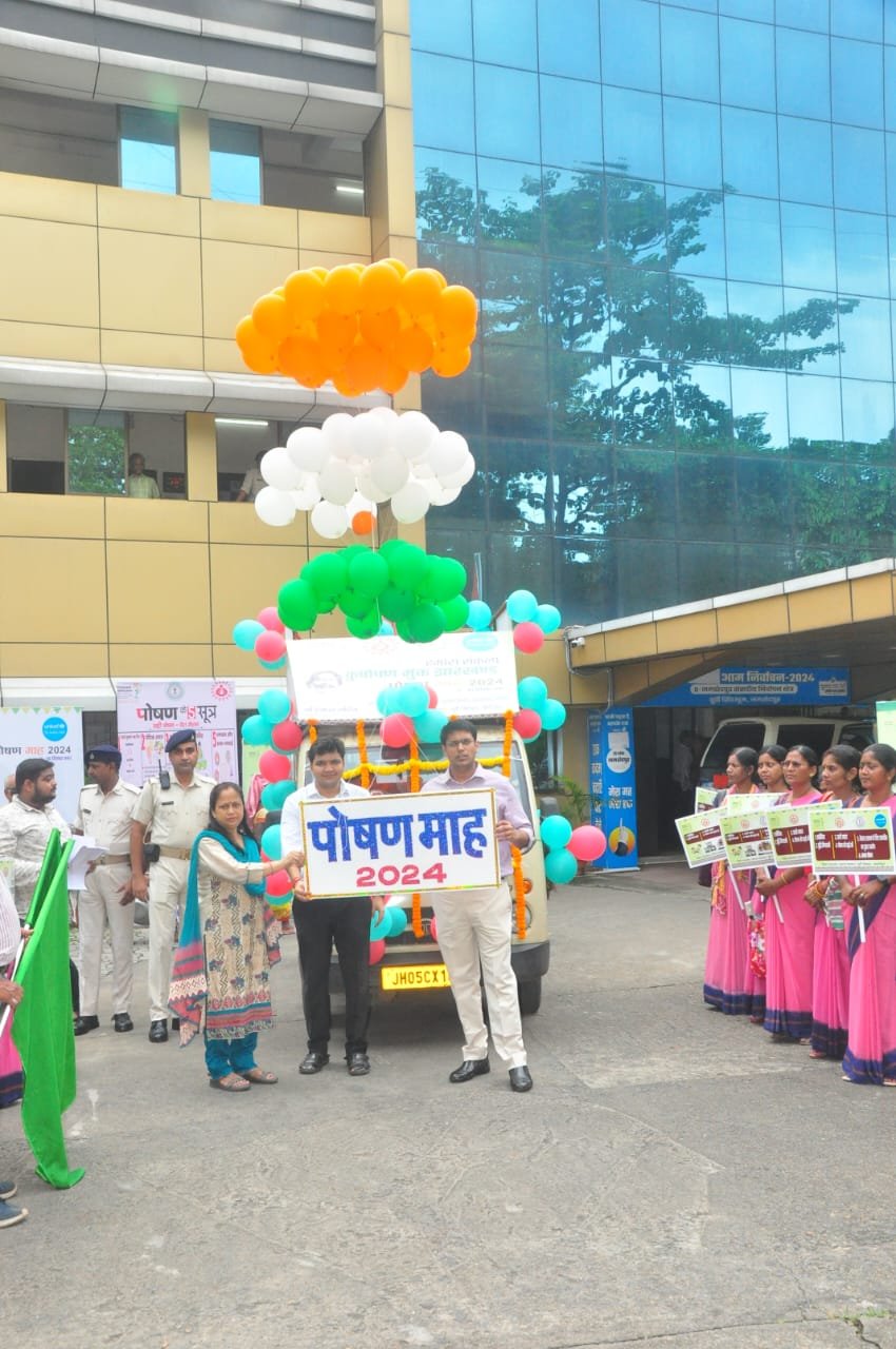 चाईबासा: आज पोषण माह 2024 के अंतर्गत तीन पोषण रथ को जिला उपायुक्त, उप विकास आयुक्त, अपर आयुक्त, जिला समाज कल्याण पदाधिकारी के द्वारा हरी झंडी दिखाकर समाहरणालय से रवाना किया गया। पोषण रथ के द्वारा बच्चों के पोषण एवं कुपोषण से बचाव, अनीमिया से बचाव एवं कुपोषण मुक्त झारखंड के तहत झारखंड सरकार की अति महत्वाकांक्षी समर कार्यक्रम के प्रचार-प्रसार किया जाएगा। साथ ही पोषण माह 2024 पर हस्ताक्षर अभियान का शुभारंभ उपायुक्त, प० सिंहभूम, चाईबासा के द्वारा सही पोषण, देश रोशन के नारों का उल्लेख एवं हस्ताक्षर कर किया गया। पोषण माह 2024 पर सही पोषण, देश रोशन पर सभी उपस्थित पदाधिकारियों एवं कर्मियों को शपथ दिलाया गया।