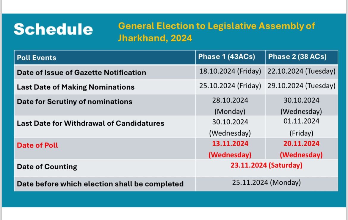 **नई दिल्ली:** भारत चुनाव आयोग ने आज, मंगलवार को एक प्रेस कॉन्फ्रेंस में झारखंड और महाराष्ट्र के विधानसभा चुनाव की तारीखों की घोषणा की। मुख्य चुनाव आयुक्त राजीव कुमार ने जानकारी दी कि झारखंड में चुनाव दो चरणों में होंगे।
