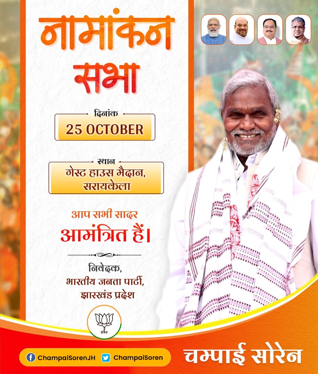 अपने संदेश में चम्पई सोरेन ने कहा, “जोहार सरायकेला, आपके प्रतिनिधि के तौर पर, पिछले साढ़े चार दशकों से आपके हर सुख-दुख का साथी रहा हूँ। आपका सहयोग एवं समर्थन मेरे जीवन के इस नए अध्याय में बहुत महत्वपूर्ण है। आगामी 25 अक्टूबर को, फिर एक बार, सरायकेला की जनता का प्रतिनिधि बनने के लिए नामांकन करने जा रहा हूँ।”