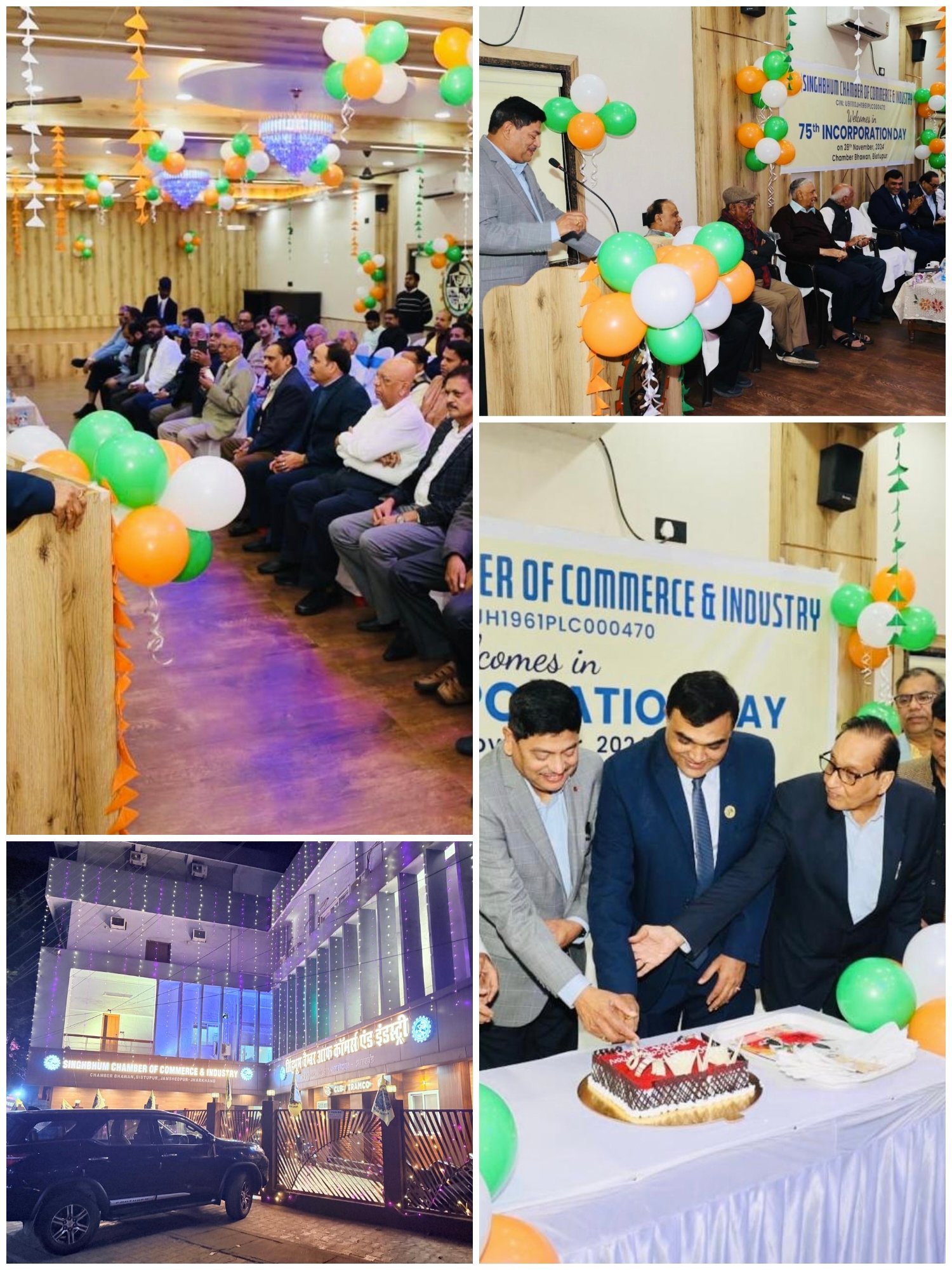 सिंहभूम चैम्बर ऑफ कॉमर्स एंड इंडस्ट्री के द्वारा 28 नवंबर को चैम्बर भवन में 75वें इनकॉर्पोरेशन डे के रूप में मनाया गया। इस अवसर पर मुख्य अतिथि के रूप में टाटा स्टील के उपाध्यक्ष (रॉ मैटेरियल) डी.बी. सुंदरामम एवं पूर्व अध्यक्षगण उपस्थित थे। कार्यक्रम में व्यापारी एवं उद्यमीगण पूर्व अध्यक्षों से अनुभवों से चैम्बर की 74 वर्षों की विकास गाथा से अवगत हुये। इस अवसर पर चैम्बर में आकर्षक विद्युत सज्जा की गई।