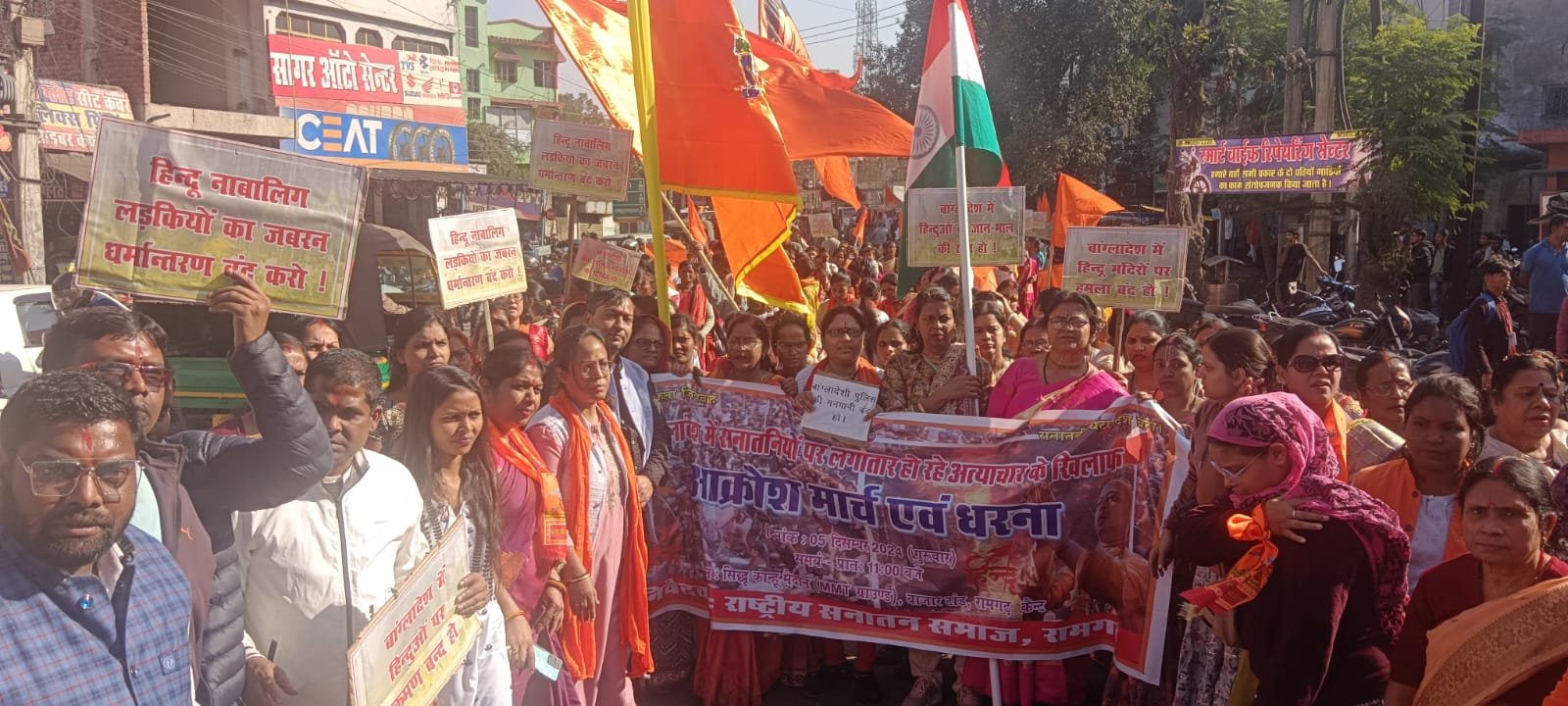 राष्ट्रीय सनातन समाज के तत्वधान में शहर के सिद्धू-कान्हू मैदान में एकत्रित होकर आक्रोश मार्च निकाला। आक्रोश मार्च में सैकड़ों लोग हाथों में बैनर, तख्ती और भगवा ध्वज लेकर सड़क पर उतरे। यह लोग चट्टी बाजार, झंडा चौक, थाना चौक, मेन रोड, सुभाष चौक होते हुए फुटबॉल ग्राउंड तक पहुंचे। रैली में राजनीतिक पार्टियों और सकल हिंदू समाज के अलावा बड़ी संख्या में मातृशक्तियां भी मौजूद थीं। पूरी रैली में भगवा ध्वज लहराते नजर आए। अनामिका श्रीवास्तव ने कहा कि बांग्लादेश में हिंदू समाज पर हो रहे अत्याचारों से संपूर्ण हिंदू समाज में आक्रोश है। उन्होंने संयुक्त राष्ट्र और भारत सरकार से बांग्लादेश सरकार पर दबाव बनाने और दंगाइयों पर तुरंत कार्रवाई की मांग की। उन्होंने कहा कि बांग्लादेश में अल्पसंख्यकों के साथ हो रही घटनाएं रोकने के लिए अंतरराष्ट्रीय स्तर पर प्रयास जरूरी हैं। कार्यक्रम में वनवासी कल्याण केंद्र के रिशु मुंडा, एकल अभियान के चन्द्र शेखर, पतंजलि के प्रमोद लाल, विश्व हिंदू परिषद के मनोज पोद्दार, सनातन समाज के विभिन्न संगठनों के लोगों ने अपने विचार व्यक्त किए।