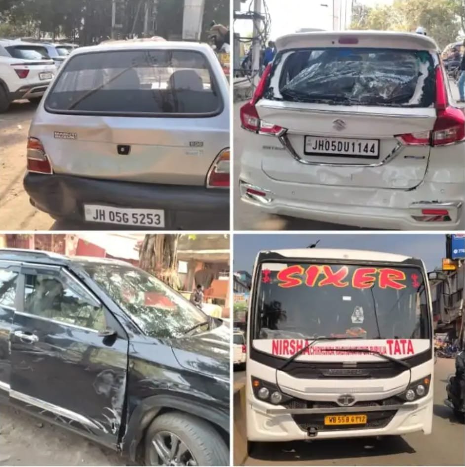 बस ने सड़क के बीचों-बीच रुकने से पहले चार कारों को पीछे से टक्कर मारी। दुर्घटनाग्रस्त कारों में जएच05 डीयू 1144, जेएच 05जी5253 सहित दो अन्य कारें शामिल हैं।