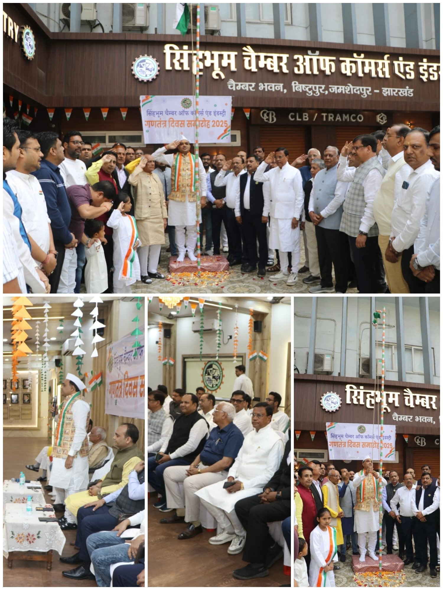 सिंहभूम चैम्बर ऑफ कॉमर्स एंड इंडस्ट्री में 76वें ‘‘गणत्रंता दिवस’’ पर रविवार, 26 जनवरी, 2025 को अध्यक्ष विजय आनंद मूनका ने झण्डा फहराकर सदस्यांे को संबोधित किया। उन्होंने कहा कि अज जब हम 76वां गणतंत्र दिवस मना रहे हैं तो हमारी मनोकामना है कि यह दिवस भारत के इतिहास में और एक विकास की परिगाथा लिखे। भारत का इतिहास और चैम्बर का इतिहास साथ-साथ चल रहा है। 1947 में देश आजाद हुआ और 1948 में चैम्बर की नींव रखी गई। 1950 में भारत का अपना संविधान बना और लागू हुआ तो चैम्बर का संवैधानिक निबंधन भी 1950 में हुआ। संविधान में देश की जनता के अधिकारों के अधिकार और कर्तव्य दोनों को विस्तृत रूप में दर्शाया गया। लेकिन हम केवल अपने अधिकारों के प्रति ही ज्यादा सजग रहते हैं। अगर हम अपने अधिकारों के प्रति सजग रहते हैं तो अपने कर्तव्यों का निर्वहन भी उसी सजगता के साथ करना चाहिए तभी हम इस देश के सच्चे नागरिक कहलाने के योग्य होंगे। गण और तंत्र का मतलब होता है जनता और शासक। ये दोनों आपस में जुड़े हुये है। दोनों के एक दूसरे के प्रति जिम्मेदार होना है। अध्यक्ष विजय आनंद मूनका ने कहा कि संगठित होकर सजगता के साथ चलना ही सफलता की कुंजी है। इसलिये हम सबों को संगठित रहना है और सजगता बनाये रखनी होगी।
