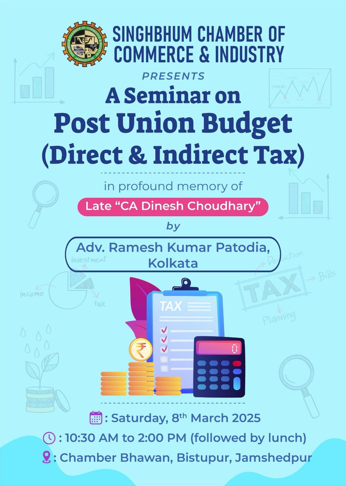 सिंहभूम चैम्बर ऑफ कॉमर्स एंड इंडस्ट्री के द्वारा चैम्बर के पूर्व उपाध्यक्ष स्व. सीए दिनेश चौधरी की स्मृति में पोस्ट बजट सेमिनार का आयोजन शनिवार, दिनांक 8 मार्च, 2025 को पूर्वाह्न 10.30 बजे से चैम्बर भवन में किया जायेगा जिसमंें कोलकाता से आये अनुभवी विशेषज्ञ अधिवक्ता रमेश कुमार पटोदिया, यूनियन बजट- 2025 पर डायरेक्ट एवं इनडायरेक्ट टैक्स से संबंधित विषय पर अपने व्याख्यान देंगे। यह जानकारी सचिव अधिवक्ता अंशुल रिंगसिया ने दी।