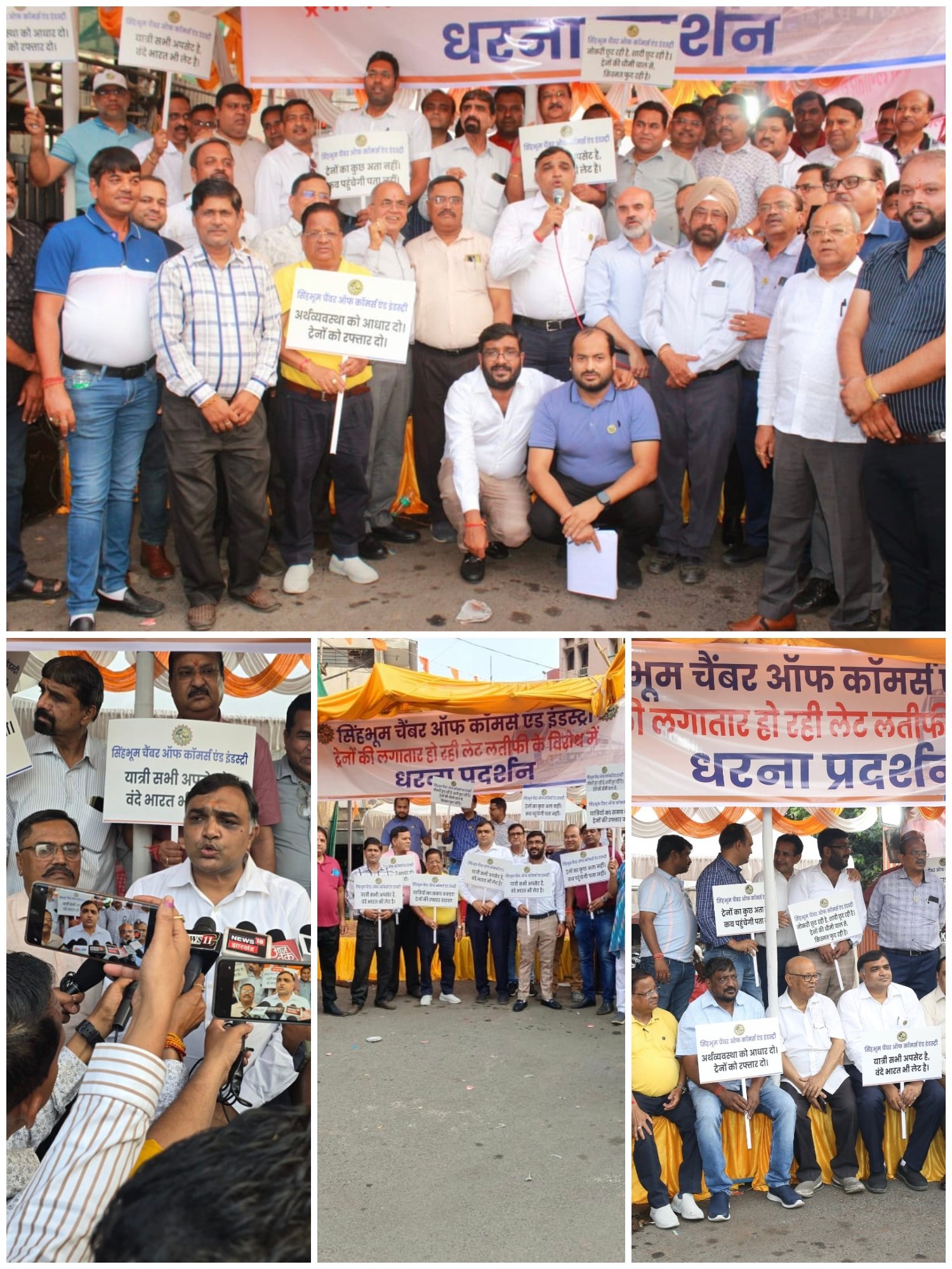 सिंहभूम चैम्बर के द्वारा जुगसलाई के वीर कुवर सिंह चौक/घोड़ा चौक पर एकदिवसीय धरना प्रदर्शन कर रेलवे को नींद से जगाने का कार्य किया गया जिससे पिछले कई महीनों से दक्षिण पूर्व रेलवे के अंतर्गत चलने वाली रेलगाड़ियां जो भाया टाटानगर होकर गुजरती है के लगातार घंटों विलंब से परिचालित होने एवं रेलगाड़ियों के रद्द कर दिये जाने से परेशान रेल यात्रियों को छुटकारा मिल सके और रेलवे इसमें सुधार हेतु जल्द से जल्द कदम उठाते हुये त्वरित कार्रवाई करने के लिये बाध्य हो।