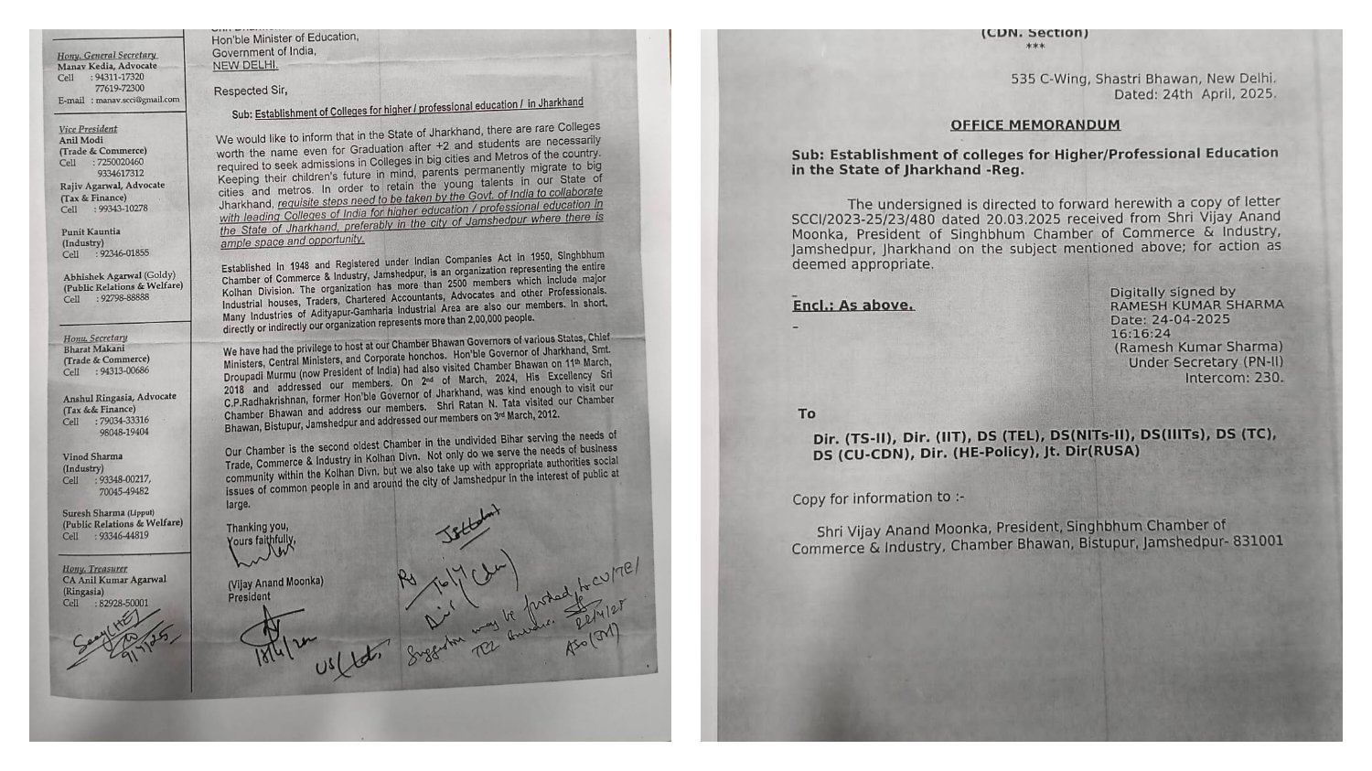 सिंहभूम चैम्बर ऑफ कॉमर्स एंड इंडस्ट्री के द्वारा जमशेदपुर में उच्च शिक्षण संस्थानों की स्थापना हेतु भारत सरकार के शिक्षा मंत्री धमेन्द्र प्रधान को पत्र के माध्यम से ध्यानाकृष्ट कराया गया था। उच्च शिक्षा मंत्रालय ने देश के विभिन्न शिक्षण संस्थानों को इस दिशा में आगे बढ़कर जमशेदपुर में इसकी स्थापना हेतु अग्रेतर कार्रवाई करने हेतु चैम्बर की इस मांग को प्रेषित किया है।