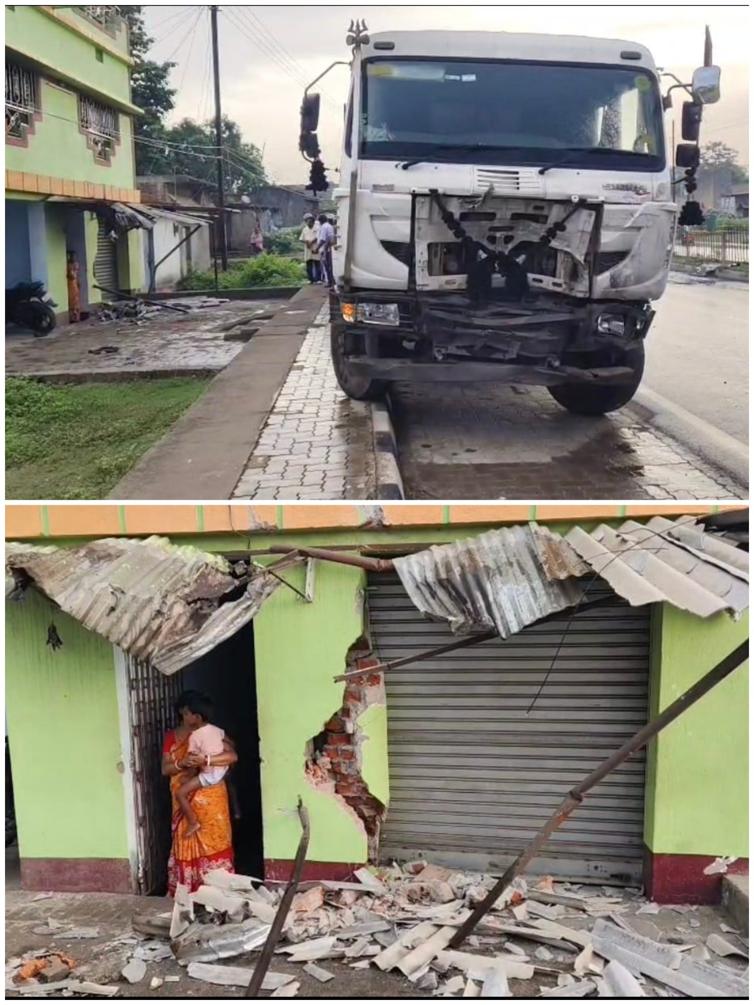 नीमडीह।सरायकेला-खरसावां जिले के नीमडीह थाना क्षेत्र में एक बड़ा सड़क हादसा होते-होते टल गया। जानकारी के अनुसार, एक तेज रफ्तार टिप ट्रेलर पुरुलिया से जमशेदपुर की ओर जा रही थी। इसी दौरान चालक ने नियंत्रण खो दिया और ट्रेलर सीधे सीपीएम नेता सुरेंद्र नाथ महतो के घर और उनकी किराने की दुकान में जा घुसी। हादसा इतना जबरदस्त था कि दुकान पूरी तरह क्षतिग्रस्त हो गई।