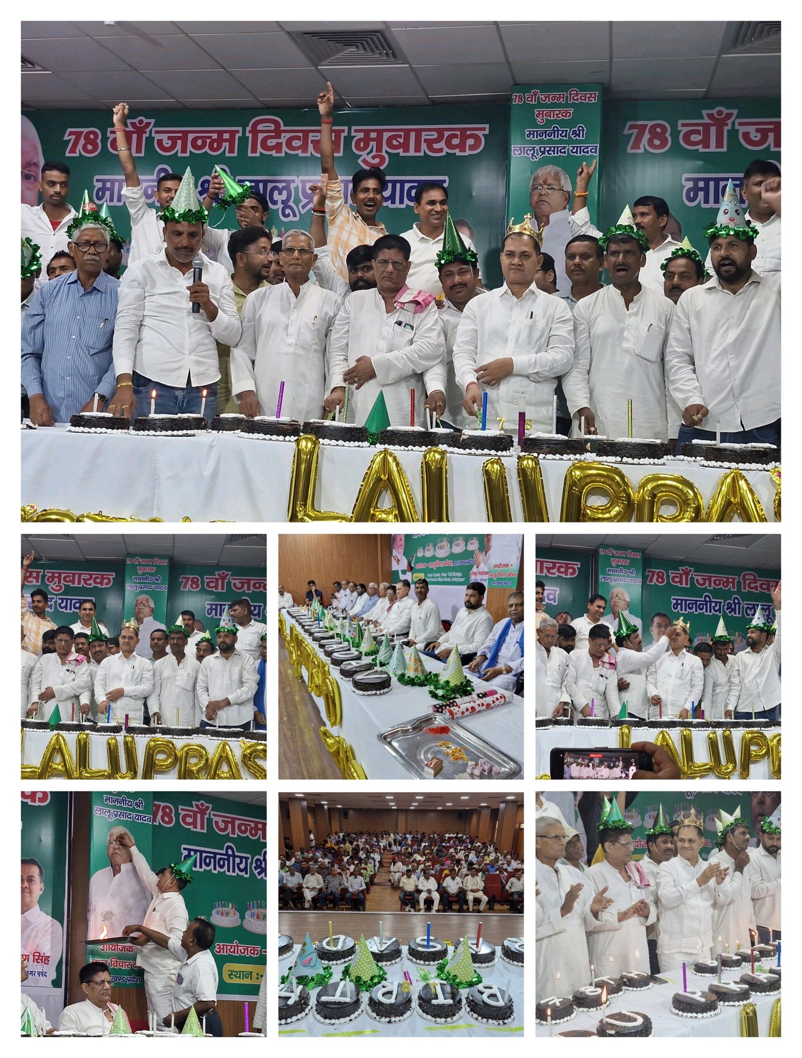 लालू विचार केंद्र, झारखंड प्रदेश द्वारा आदित्यपुर ऑटो क्लस्टर सभागार में आदित्यपुर नगर परिषद के पूर्व उपाध्यक्ष सह प्रदेश महासचिव प्रभारी पूर्वी सिंहभूम राजद व लालू विचार केंद्र के संयोजक पुरेंद्र नारायण सिंह के नेतृत्व में राजद सुप्रीमो बिहार के पूर्व मुख्यमंत्री पूर्व केंद्रीय मंत्री सामाजिक न्याय के मसीहा श्री लालू प्रसाद यादव के 78 वें जन्मदिन के अवसर पर 78 पाउंड का केक काटकर धूमधाम से मनाया गयाl केक करते ही कार्यकर्ताओं ने “हैप्पी बर्थ डे टू यू लालू प्रसाद यादव” के गगन भेदी नारे लगने लगे.