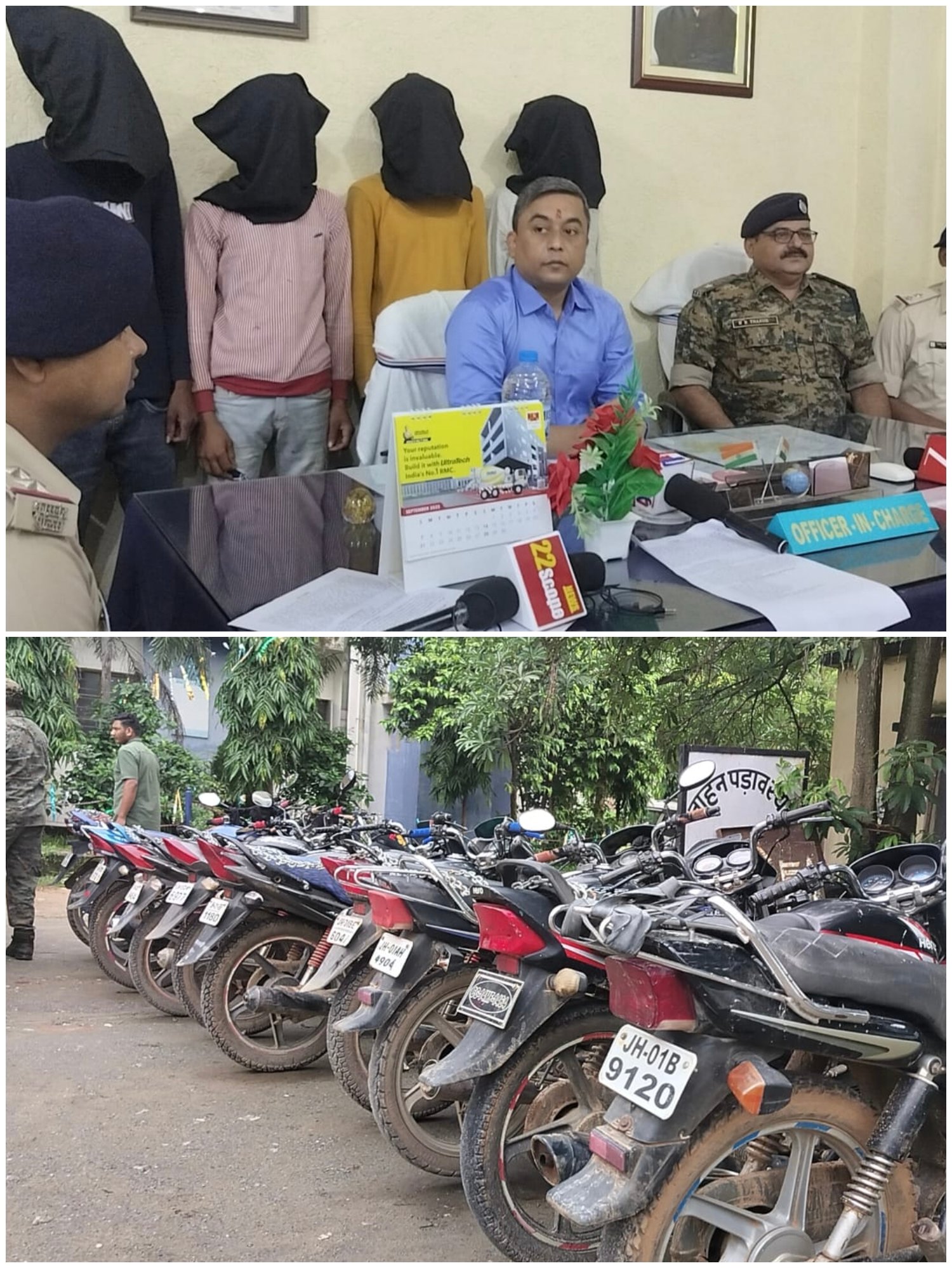 लोहरदगा : मोटरसाइकिल चोरी की घटनाओं को लेकर लोहरदगा पुलिस ने बड़ी कार्रवाई करते हुए चोरी की सात मोटरसाइकिल के साथ चार अपराधियों को गिरफ्तार कर जेल भेज दिया है। पुलिस अधीक्षक सादिक अनवर रिजवी के निर्देश पर एक विशेष टीम का गठन कर इस गिरोह का भंडाफोड़ किया गया।