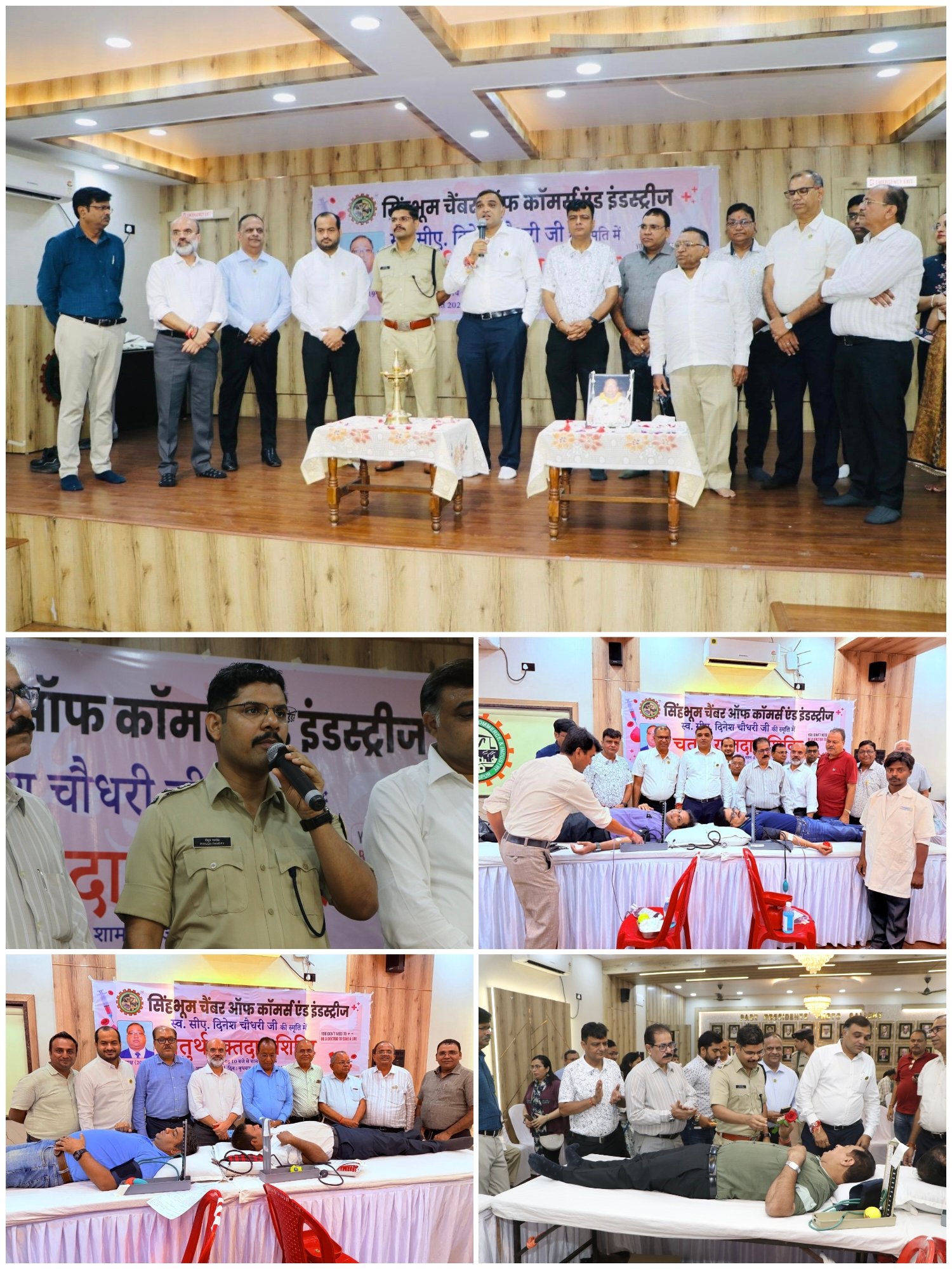 सिंहभूम चैम्बर ऑफ कॉमर्स एंड इंडस्ट्री के द्वारा चैम्बर के पूर्व उपाध्यक्ष (वित्त एवं कराधान) स्व. दिनेश चौधरी की पुण्यतिथि पर चौथी बार चैम्बर भवन में बुधवार 13 अगस्त, 2025 को पूर्वाह्न 10.00 बजे से संध्या 4.00 बजे तक आयोजित रक्तदान शिविर का उद्घाटन जिले के वरीय आरक्षी अधीक्षक पीयूष पांडे, भा.पु.से. एवं सिविल सर्जन डा0 साहिर पाल के द्वारा संयुक्त्त रूप से किया गया। रक्तदान शिविर में स्व. दिनेश चौधरी के परिवार के सदस्यगणों की उपस्थिति भी रही। इस अवसर पर उनके बड़े भाई सुरेश चौधरी एवं छोटे भाई आनंद चौधरी ने चैम्बर के द्वारा स्व0. सीए दिनेश चौधरी की स्मृति किये जा रहे चौथे रक्तदान शिविर के प्रति चैम्बर का आभार जताया। उक्त जानकारी मानद महासचिव मानव केडिया ने दी।