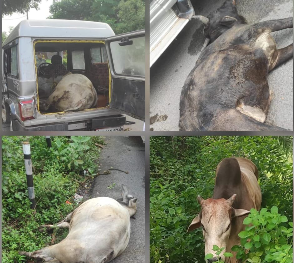 ग्रामीणों ने बताया कि छोटे वाहन में चार बड़े बैलों को जबरदस्ती ठूंसकर उनकी जीभ और टांगों को मोटी रस्सियों से बांध दिया गया था, जिससे दम घुटने और अत्यधिक दबाव के कारण तीन मवेशियों की मौके पर ही मौत हो गई।