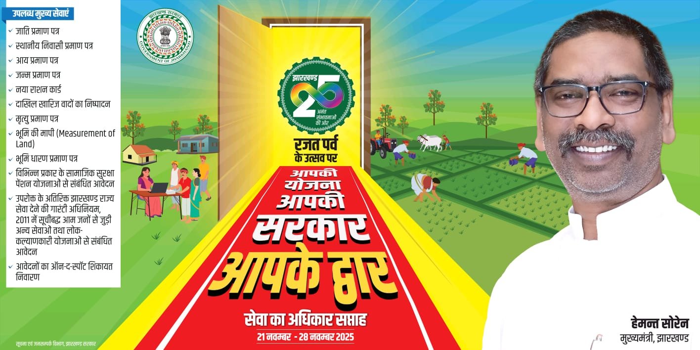 जमशेदपुर। पूर्वी सिंहभूम जिले में राज्य सरकार द्वारा संचालित “आपकी योजना-आपकी सरकार, आपके द्वार” कार्यक्रम को इस वर्ष “सेवा का अधिकार सप्ताह” के रूप में 21 से 28 नवंबर 2025 तक मनाया जा रहा है। सरकार ने झारखंड राज्य सेवा देने की गारंटी अधिनियम, 2011 को प्राथमिकता देते हुए इस विशेष साप्ताहिक अभियान को राज्यभर में प्रभावी तरीके से लागू करने का निर्णय लिया है।