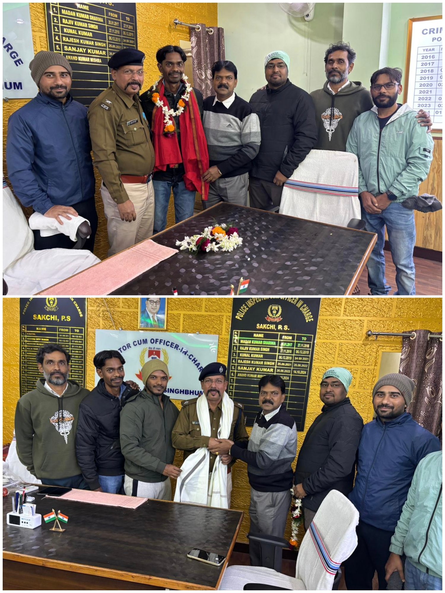 जमशेदपुर : टाटा स्टील द्वारा 30 नवंबर को जमशेदपुर में आयोजित हाफ मैराथन दौड़ ( 21.097 किमी ) में शानदार प्रदर्शन करने पर इंस्पेक्टर सह साकची थाना प्रभारी आनंद मिश्रा का शहर के धावकों का चर्चित ग्रुप ” जमशेदपुर रनजीनियर्स ग्रुप ” द्वारा गर्मजोशी से स्वागत किया गया। इस दौरान आनंद मिश्रा को अंग वस्त्र भेंटकर तथा पुष्प का माला पहनाकर स्वागत किया गया। स्वागत करने वालों में जमशेदपुर रनजीनियर्स ग्रुप के दीपक कुमार, अरूपा नंद महतो, इम्तियाज अली, प्रभाकर कुमार, धर्मेन्द्र कुमार, अरूंजय कुमार, अभिषेक पाण्डेय शामिल थे।