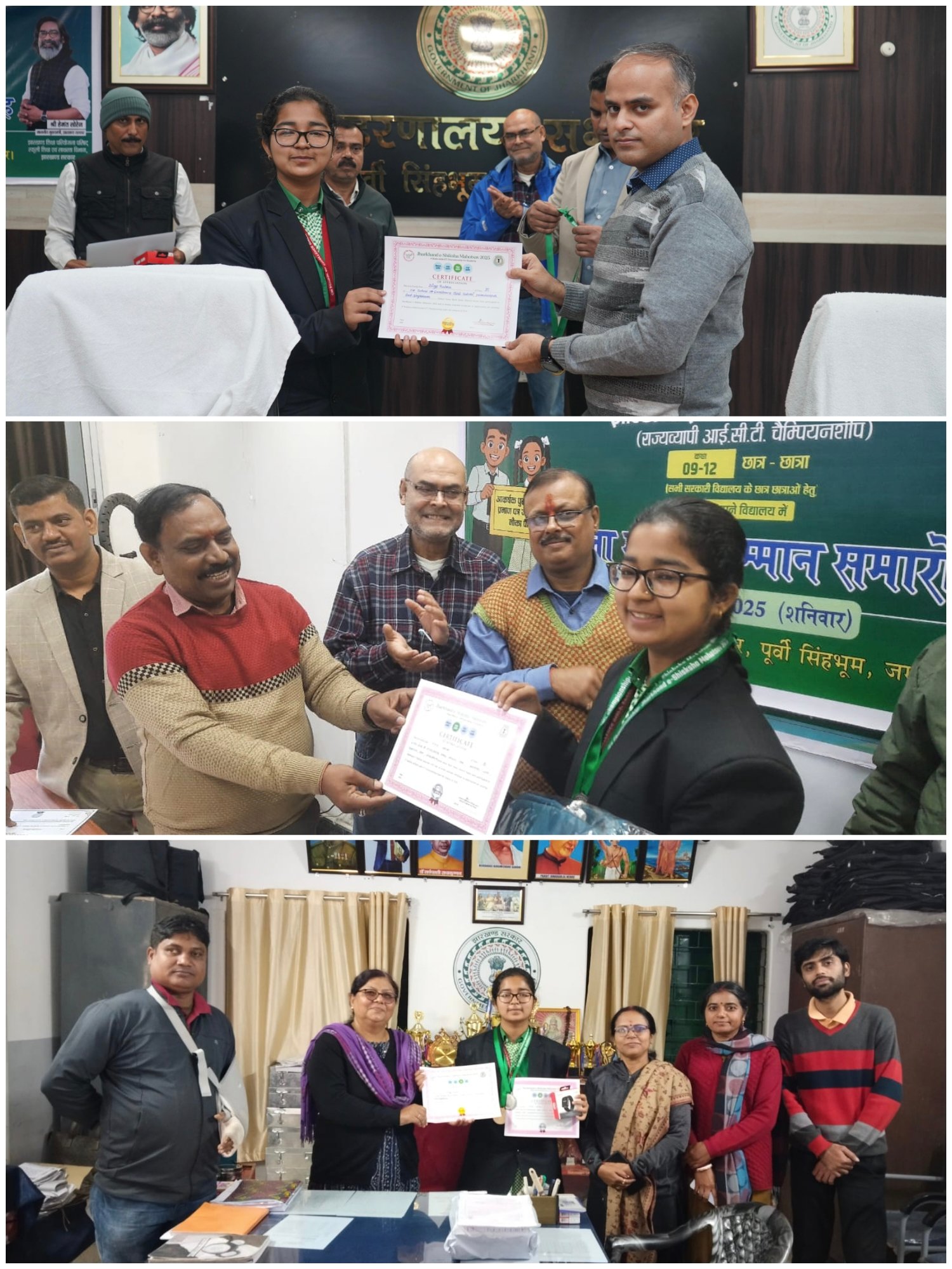 वही पूर्वी सिंहभूम शिक्षा विभाग कार्यालय में प्रखंड स्तर पर प्रथम स्थान आने पर “दिव्य रत्न” को एक रजत पदक, एक स्कूल बैग एवं प्रमाण पत्र देकर सम्मानित किया गया।