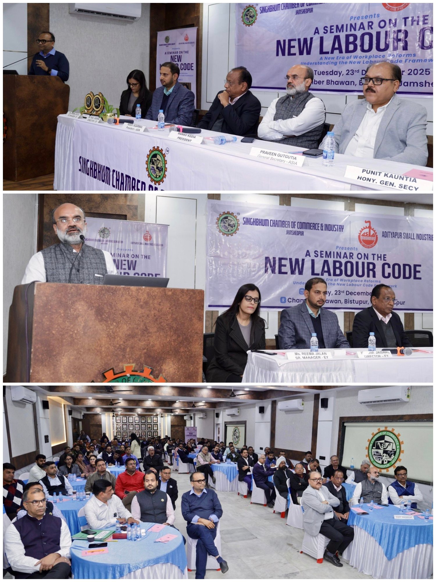 सिंहभूम चैंबर ऑफ कॉमर्स एंड इंडस्ट्री (SCCI), जमशेदपुर एवं आदित्यपुर स्मॉल इंडस्ट्रीज एसोसिएशन (ASIA) के संयुक्त तत्वावधान में “नई श्रम संहिता (New Labour Code)” पर एक विशेष सेमिनार का सफल आयोजन मंगलवार, 23 दिसंबर 2025 को चैंबर भवन, बिष्टुपुर, जमशेदपुर में किया गया। इस सेमिनार में क्षेत्र के उद्योगपतियों, व्यवसायियों, एचआर प्रोफेशनल्स एवं प्रबंधन प्रतिनिधियों ने बड़ी संख्या में सहभागिता की।