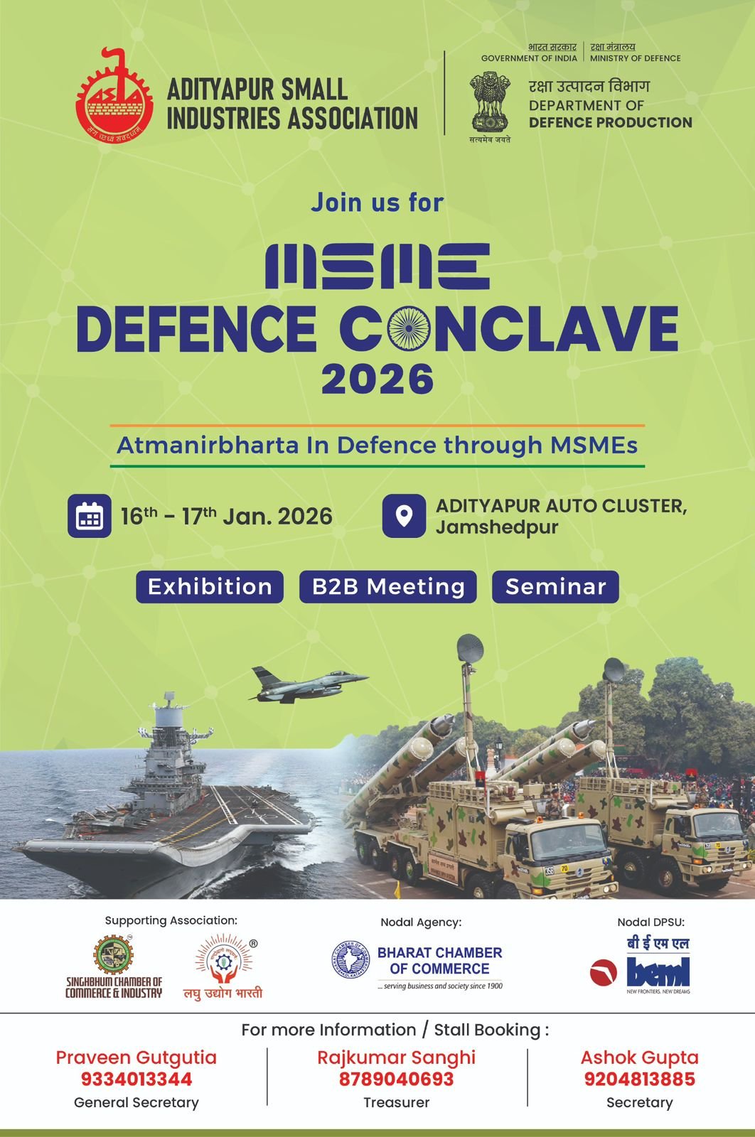 आत्मनिर्भर भारत के लिये स्थानीय उद्योगों को बढ़ावा देने के उद्देश्य से कोल्हान@जमशेदपुर के विभिन्न व्यवसायिक संस्थाओं के संयुक्त तत्वावधान में *आदित्यपुर आटो कलस्टर में एमएसएमई डिफेंस कॉन्क्लेव 2026* का आयोजन किया जा रहा है। इस हेतु एक *प्रेस-वार्ता का आयोजन चैम्बर भवन बिष्टुपुर में शनिवार दिनांक 03-01-2026 को संध्या 4-00 बजे* से किया जायेगा।