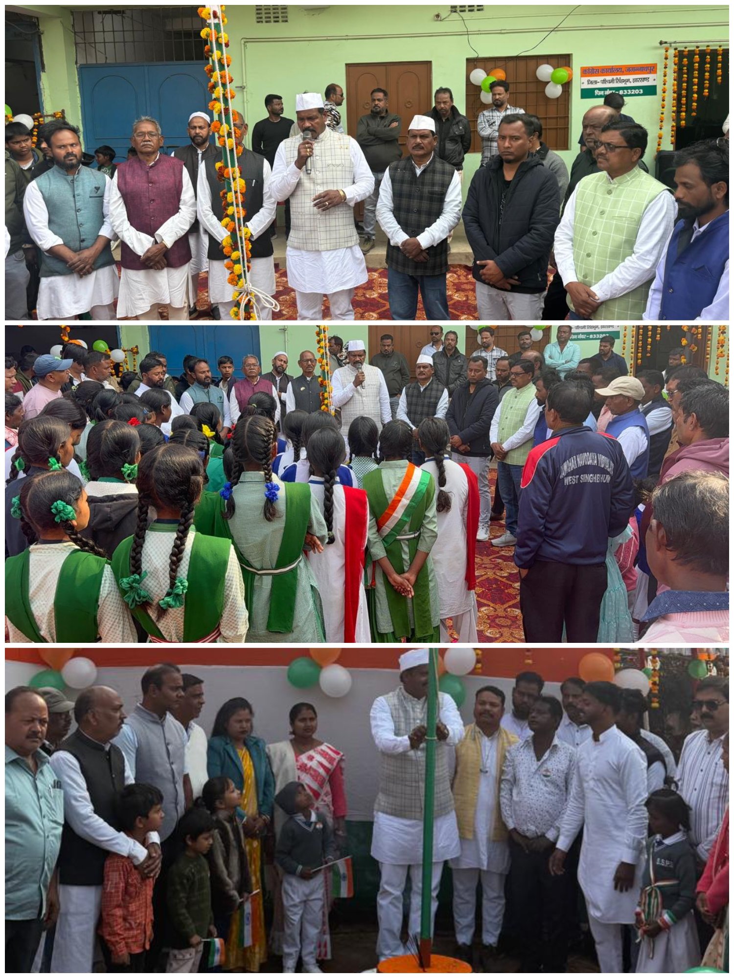 जगन्नाथपुर। पश्चिमी सिंहभूम जिला में कांग्रेस प्रखण्ड कार्यालय, जगन्नाथपुर में गणतंत्र दिवस के अवसर पर ध्वजारोहण कार्यक्रम का आयोजन किया गया। इस अवसर पर जगन्नाथपुर विधायक सह उप मुख्य सचेतक (सत्तारूढ़ दल) सोनाराम सिंकु ने झंडोत्तोलन किया। ध्वजारोहण के बाद उपस्थित नेताओं और कार्यकर्ताओं ने राष्ट्रीय एकता और देशभक्ति के संकल्प को दोहराया।