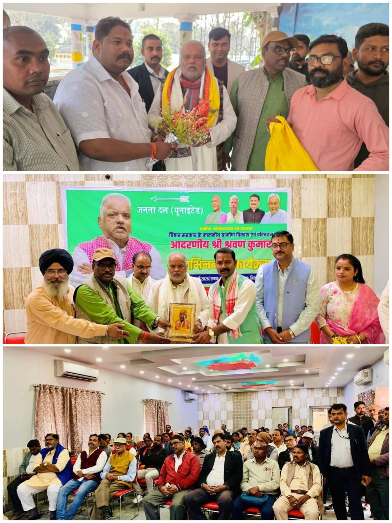जनता दल यूनाइटेड के बिहार राज्य ग्रामीण विकास सह परिवहन मंत्री श्री श्रवण कुमार जी का जमशेदपुर आगमन पर जदयू के प्रतिनिधि मंडल द्वारा सर्किट हाउस में जोरदार स्वागत किया गया तत्पश्चात उनका अभिनंदन समारोह बिष्टुपुर स्थित मिलानी हॉल मे कुशलतापूर्वक संपन्न हुआ जिसका संचालन महानगर अध्यक्ष अजय कुमार स्वागत अभिभाषण पूर्वी सिंहभूम के जिला अध्यक्ष श्री सुबोध श्रीवास्तव एवं धन्यवाद ज्ञापन जन सुविधा प्रतिनिधि नीरज सिंह के द्वारा संपन्न हुआ जिसमें सैकड़ो कार्यकर्ता उपस्थित थे।