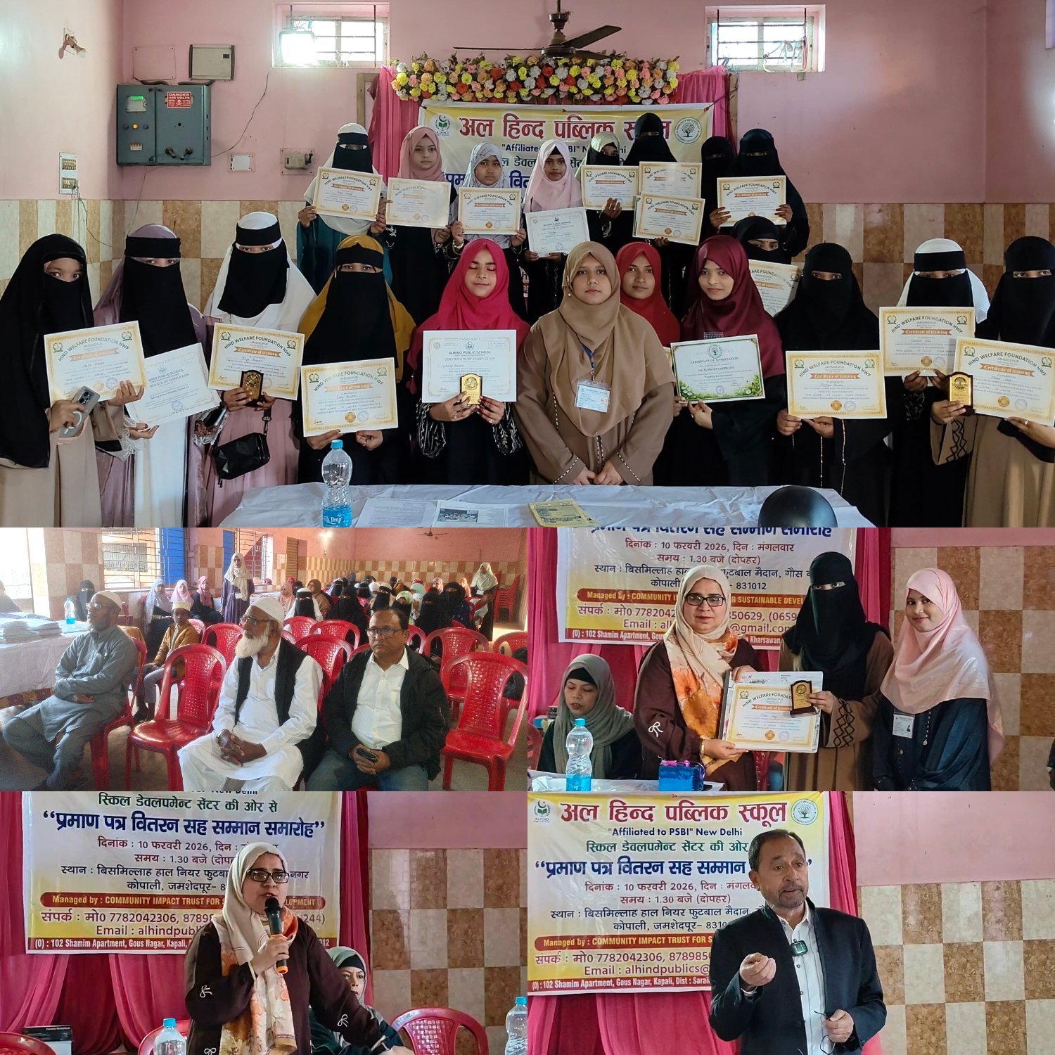 जमशेदपुर: अलहिन्द पब्लिक स्कूल कौशल विकास केंद्र परिसर में मंगलवार को “प्रमाण-पत्र वितरण सह सम्मान समारोह” हर्षोल्लास और गरिमामय वातावरण में आयोजित किया गया। कार्यक्रम का मुख्य उद्देश्य कौशल प्रशिक्षण प्राप्त कर आत्मनिर्भर बनी महिलाओं को प्रोत्साहित करना तथा उनके प्रयासों को सम्मानित करना था।