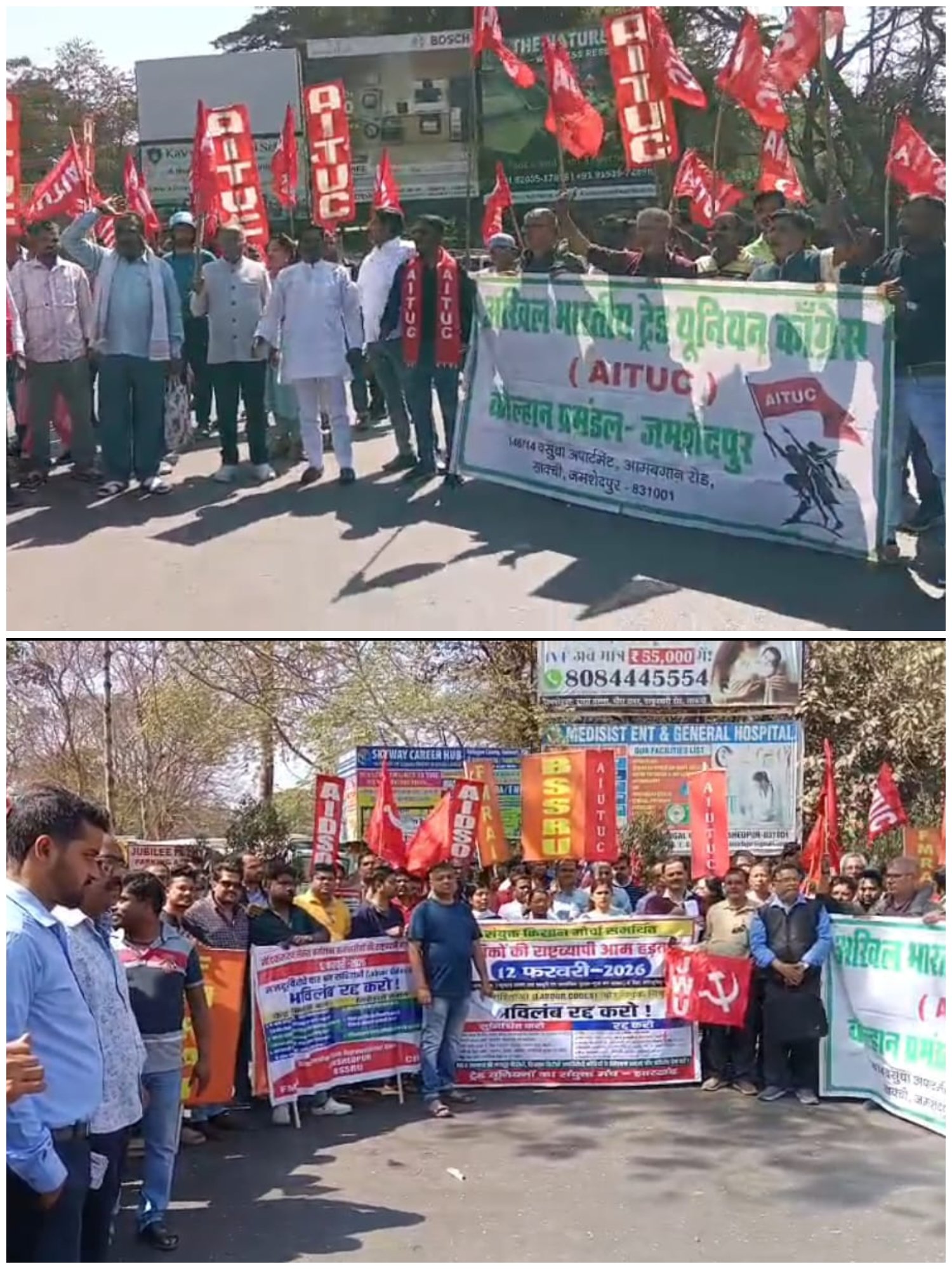 जमशेदपुर। केंद्र सरकार की नीतियों के विरोध में 12 फरवरी 2026 को आयोजित राष्ट्रव्यापी आम हड़ताल का असर जमशेदपुर में व्यापक रूप से देखने को मिला। अखिल भारतीय ट्रेड यूनियन कांग्रेस (एआईटीयूसी) के नेतृत्व में साकची स्थित आलमबाग मैदान से एक विशाल जुलूस निकाला गया, जो शहर के प्रमुख मार्गों से होते हुए जुबली पार्क स्थित उपायुक्त कार्यालय गेट तक पहुंचा। जुलूस और धरना कार्यक्रम में बिहार झारखंड सेल्स प्रतिनिधि यूनियन, भारतीय चिकित्सा एवं विक्रय प्रतिनिधि महासंघ, अखिल भारतीय लोकतांत्रिक छात्र संगठन तथा संयुक्त किसान मोर्चा समर्थित विभिन्न संगठनों के प्रतिनिधियों ने भाग लिया।