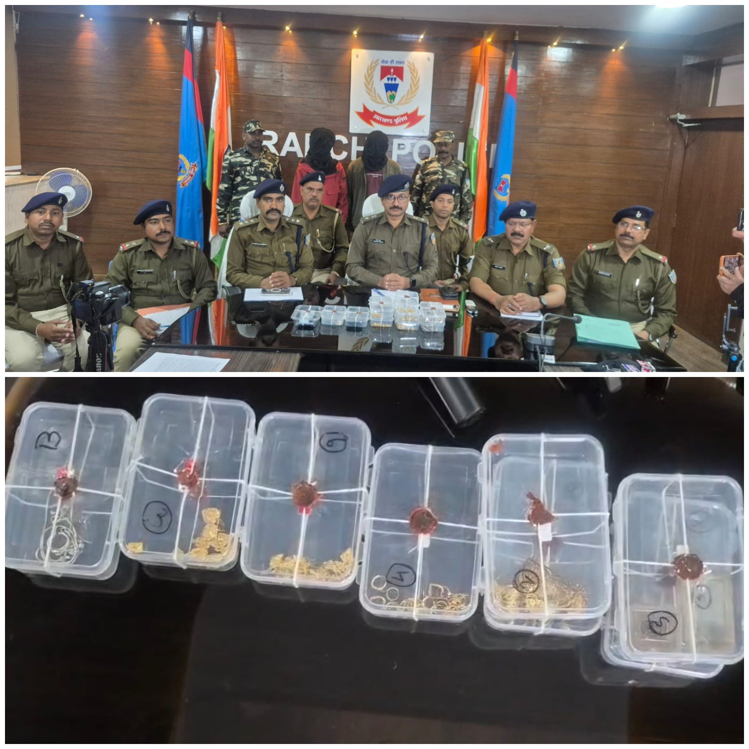 रांची। नामकुम थाना क्षेत्र में हाल ही में हुए गृहभेदन व चोरी की तीन घटनाओं का वरीय पुलिस अधीक्षक के निर्देश पर गठित एसआईटी ने खुलासा कर लिया। कांड संख्या 288/25, 20/26 व 31/26 में संदिग्धों के सत्यापन, तकनीकी सहायता व आसूचना से संगठित गिरोह का पर्दाफाश हुआ जिसमें फिरदोस अली 19 वर्ष पुत्र स्वर्गीय सरवर अली मौलाना आजाद कॉलोनी गली नंबर 5 नामकुम रांची व दिलीप सोनी 37 वर्ष पुत्र स्वर्गीय सीताराम सोनी एचबी रोड लोहरा कोंचा लालपुर रांची गिरफ्तार किए गए।यह गिरोह मुहल्लों में घूमकर बंद घरों की रेकी करता मौका पाकर ज्वेलरी व नकदी चुरा लेता था यहां तक कि दिन के समय भी कई चोरियां अंजाम दे चुका। अभियुक्तों से दो पीस गलाया सोना पत्ता एक क्वायल टूटा स्क्रैप 15.40 ग्राम, 14 अंगूठी 18 ग्राम, मंगलसूत्र लौकेट 7 नथिया एक दोलना 23.10 ग्राम, 13 लौकेट 8.5 ग्राम, 24 कान बाली 9.3 ग्राम, 22 टॉप्स 13.5 ग्राम, चांदी जैसे आभूषण 33.5 ग्राम, मोबाइल नंबर वाला रजिस्टर व ओप्पो फोन बरामद हुआ। दिलीप सोनी कांटाटोली मां ज्वेलर्स में चोरी का माल सस्ते में खरीद गला कर नया बना लेता था दोनों का ज्वेलरी चोरी खपाने का पुराना इतिहास है।गिरोह के अन्य सदस्य चिन्हित हैं छापेमारी जारी है कार्रवाई में वरीय उपाधीक्षक अमर कुमार पांडेय, थाना प्रभारी मनोज कुमार, पुअनि शशि रंजन गौतम कुमार सोनु दास, संअनि देवेंद्र सिंह जयप्रकाश उज्जवल सिंह व रिजर्व गार्ड शामिल रहे।