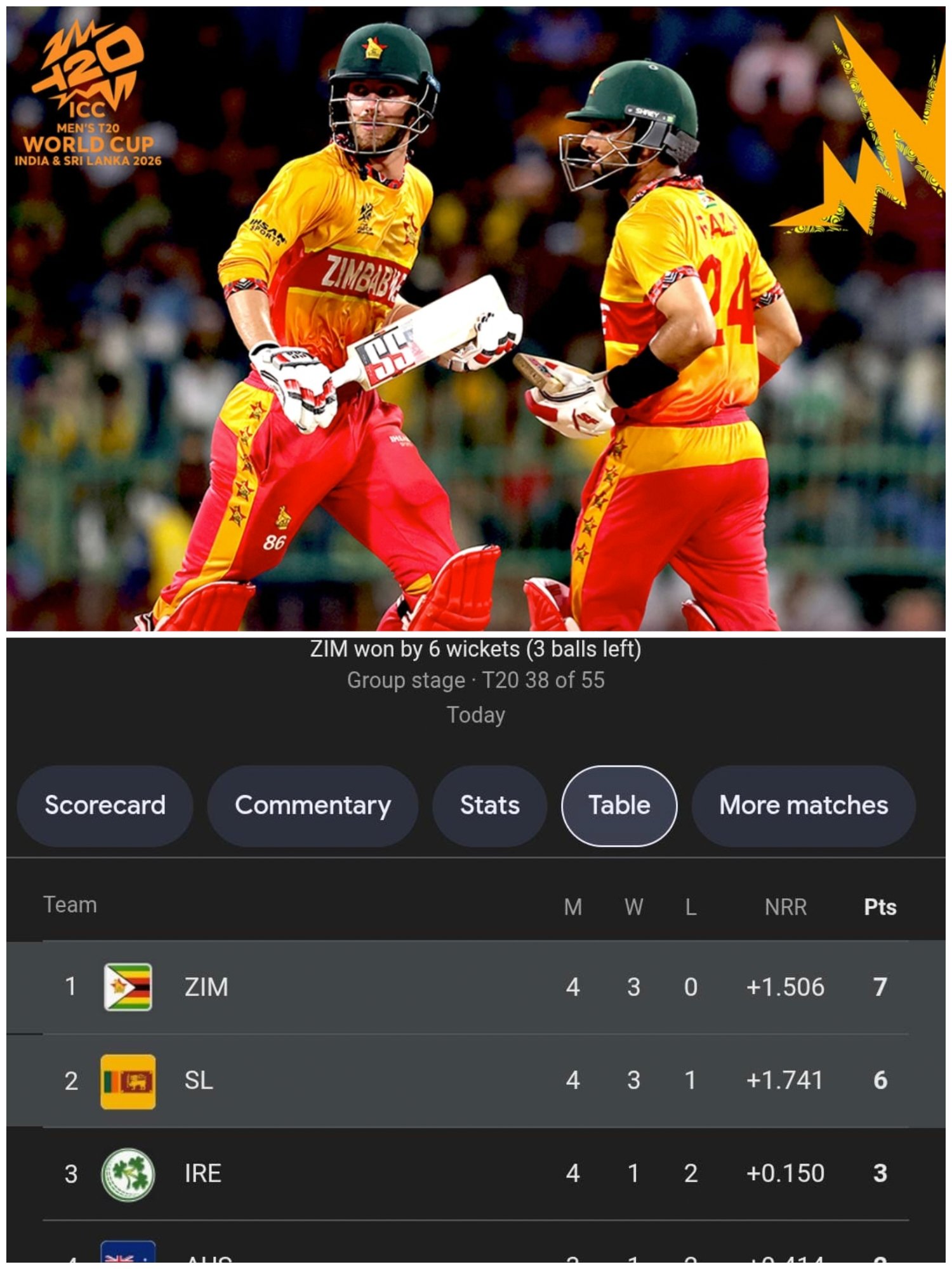 इस जीत के साथ जिम्बाब्वे ने ग्रुप-बी में शीर्ष स्थान हासिल कर लिया। टीम ने लीग चरण में चार मुकाबले खेले, जिनमें से तीन में जीत दर्ज की, जबकि एक मैच बेनतीजा रहा। सात अंकों और +1.506 के नेट रन रेट के साथ जिम्बाब्वे अंक तालिका में पहले स्थान पर पहुंच गया। मेजबान श्रीलंका, जिसने छह अंक अर्जित किए, दूसरे स्थान पर खिसक गई। उसका नेट रन रेट +1.741 रहा, जो जिम्बाब्वे से बेहतर होने के बावजूद अंकों के लिहाज से पीछे रह गया। ग्रुप-बी से जिम्बाब्वे और श्रीलंका की टीमें पहले ही सुपर-8 के लिए क्वालिफाई कर चुकी थीं।