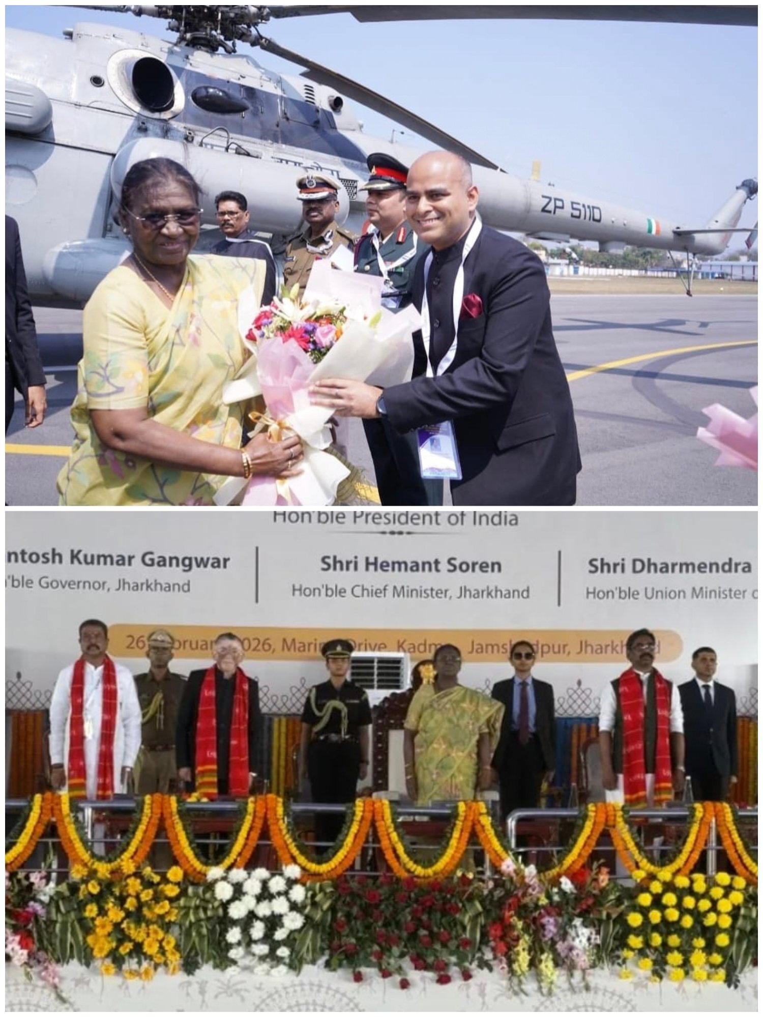जमशेदपुर।झारखंड की राजधानी रांची से गुरुवार को जमशेदपुर पहुंचीं भारत की राष्ट्रपति द्रौपदी मुर्मू का सोनारी एयरपोर्ट पर भव्य स्वागत किया गया। उनके आगमन पर झारखंड के राज्यपाल संतोष कुमार गंगवार, मुख्यमंत्री हेमंत सोरेन सहित कई वरिष्ठ अधिकारियों ने पुष्पगुच्छ भेंट कर उनका अभिनंदन किया। राष्ट्रपति के दौरे को लेकर जिला प्रशासन और सुरक्षा एजेंसियों ने पहले से व्यापक तैयारियां की थीं।