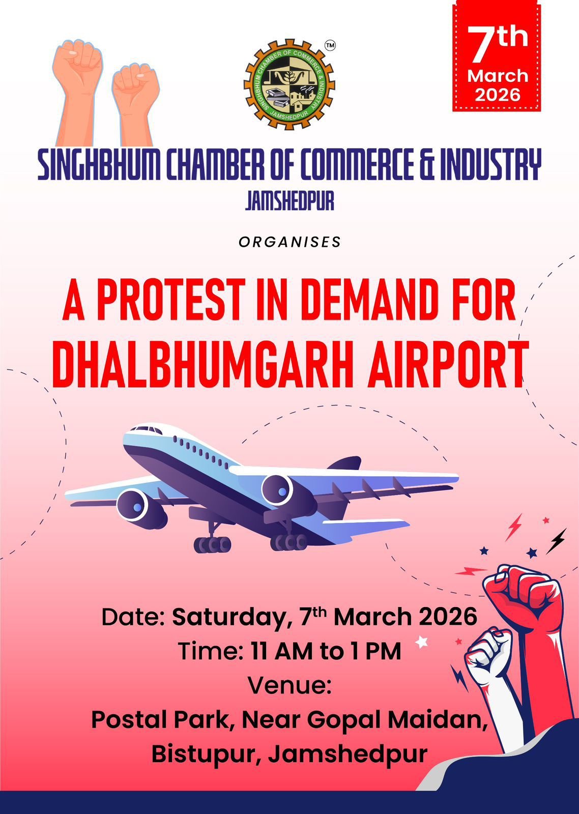जमशेदपुर के औद्योगिक एवं व्यावसायिक विकास के लिए लंबे समय से लंबित *धालभूमगढ़ एयरपोर्ट* परियोजना को शीघ्र शुरू करने की मांग को लेकर *सिंहभूम चेंबर ऑफ कॉमर्स एंड इंडस्ट्री* द्वारा विरोध-प्रदर्शन का आयोजन किया जा रहा है।