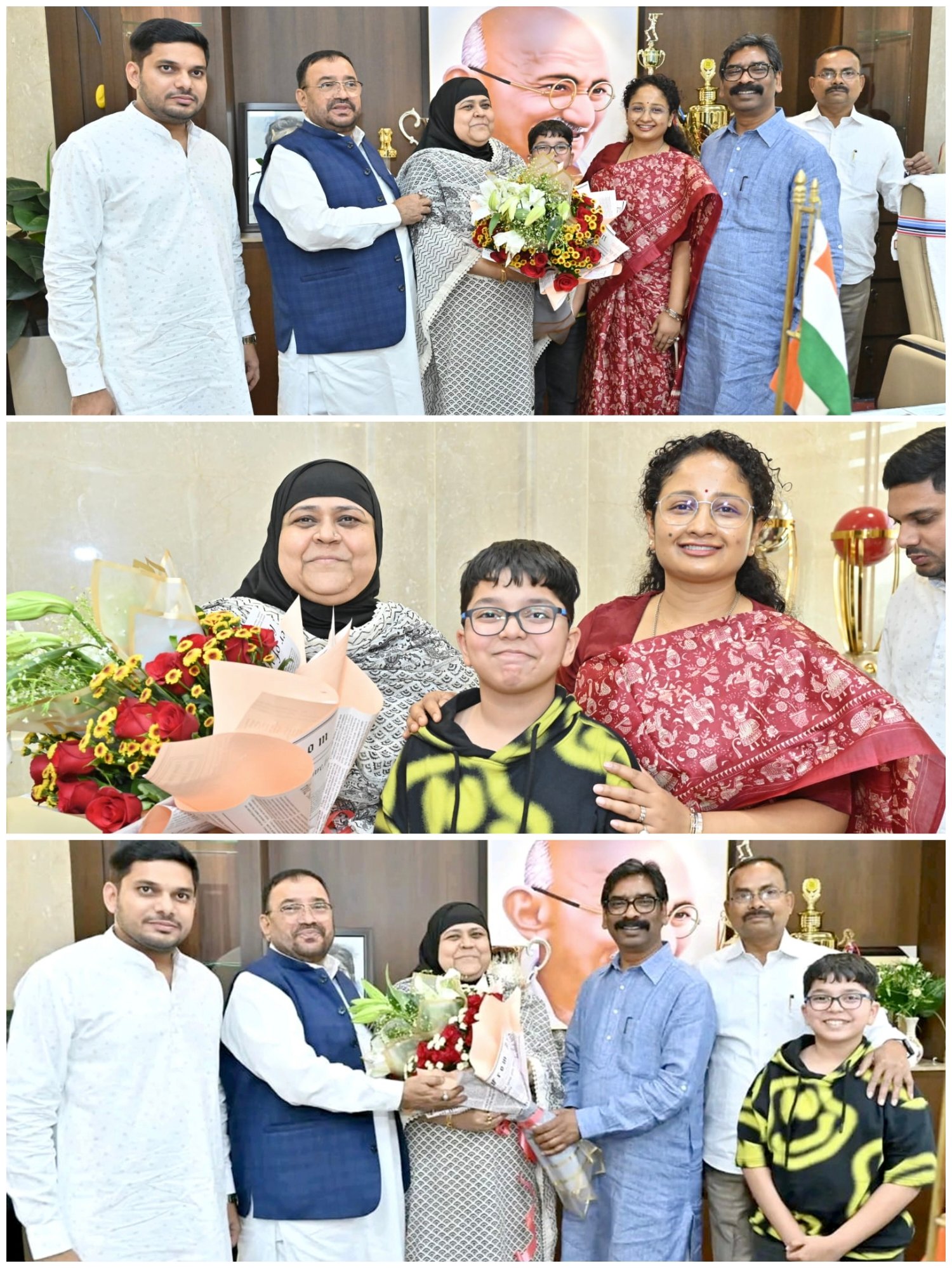 इस अवसर पर हिदायतुल्लाह खान और नौशीन खान ने उन्हें पुष्पगुच्छ भेंट कर शुभकामनाएं दीं। मुलाकात के दौरान मुख्यमंत्री हेमंत सोरेन ने जुगसलाई नगर परिषद के हालिया चुनाव में शानदार जीत हासिल करने पर नौशीन खान को हृदय से बधाई दी और उनके उज्ज्वल भविष्य के लिए शुभकामनाएं व्यक्त कीं।