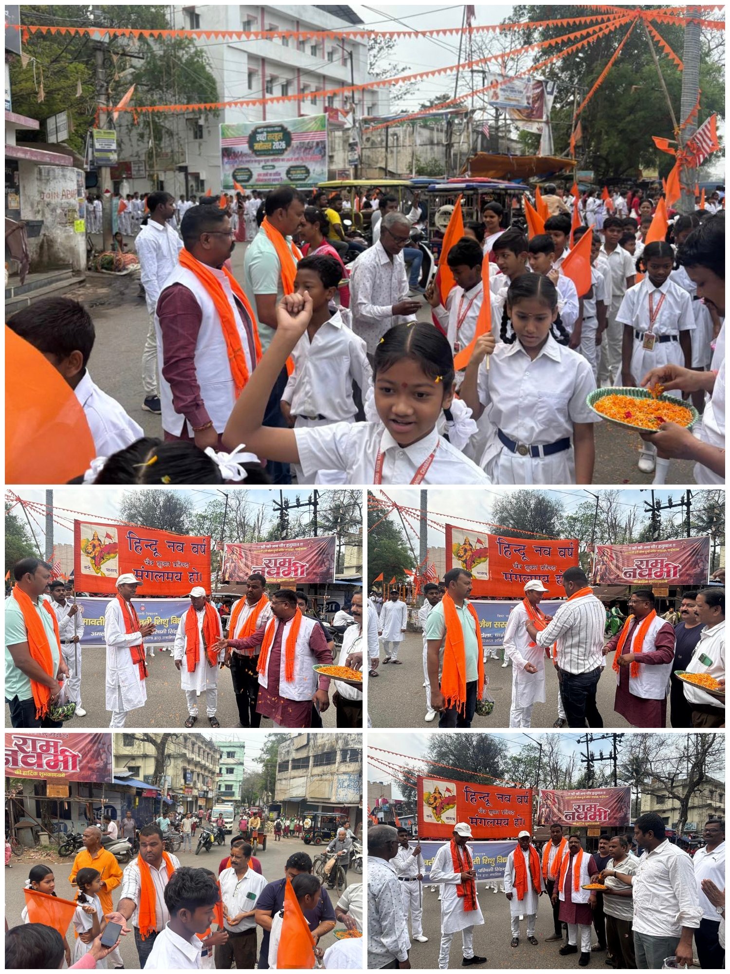 चाईबासा। पश्चिमी सिंहभूम जिला में हिंदू नव वर्ष के शुभ अवसर पर गुरुवार को पद्मावती जैन सरस्वती शिशु विद्या मंदिर द्वारा आयोजित प्रभात फेरी का चाईबासा शहर में भव्य स्वागत किया गया। इस दौरान पोस्ट ऑफिस चौक और जैन मार्केट चौक पर प्रभात फेरी में शामिल छात्रों के साथ अन्य लोगों का पुष्प वर्षा कर अभिनंदन किया गया तथा चॉकलेट का वितरण भी किया गया।