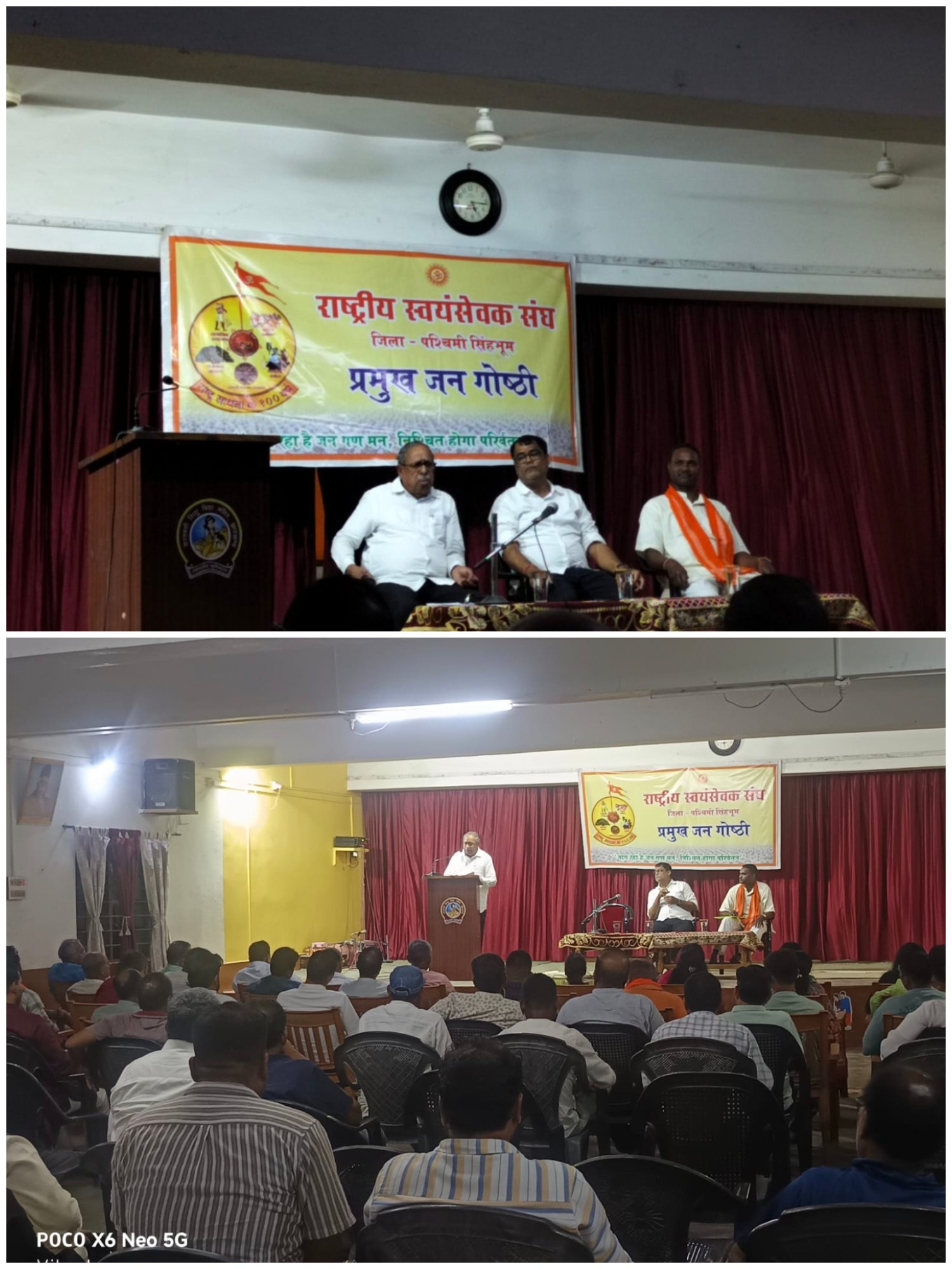 चाईबासा: राष्ट्रीय स्वयंसेवक संघ के शताब्दी वर्ष के उपलक्ष्य में चाईबासा स्थित माधव सभागार में प्रमुख जन गोष्ठी का आयोजन किया गया। कार्यक्रम में सामाजिक, राजनीतिक, शैक्षणिक और व्यावसायिक क्षेत्रों से जुड़े कई लोग शामिल हुए।