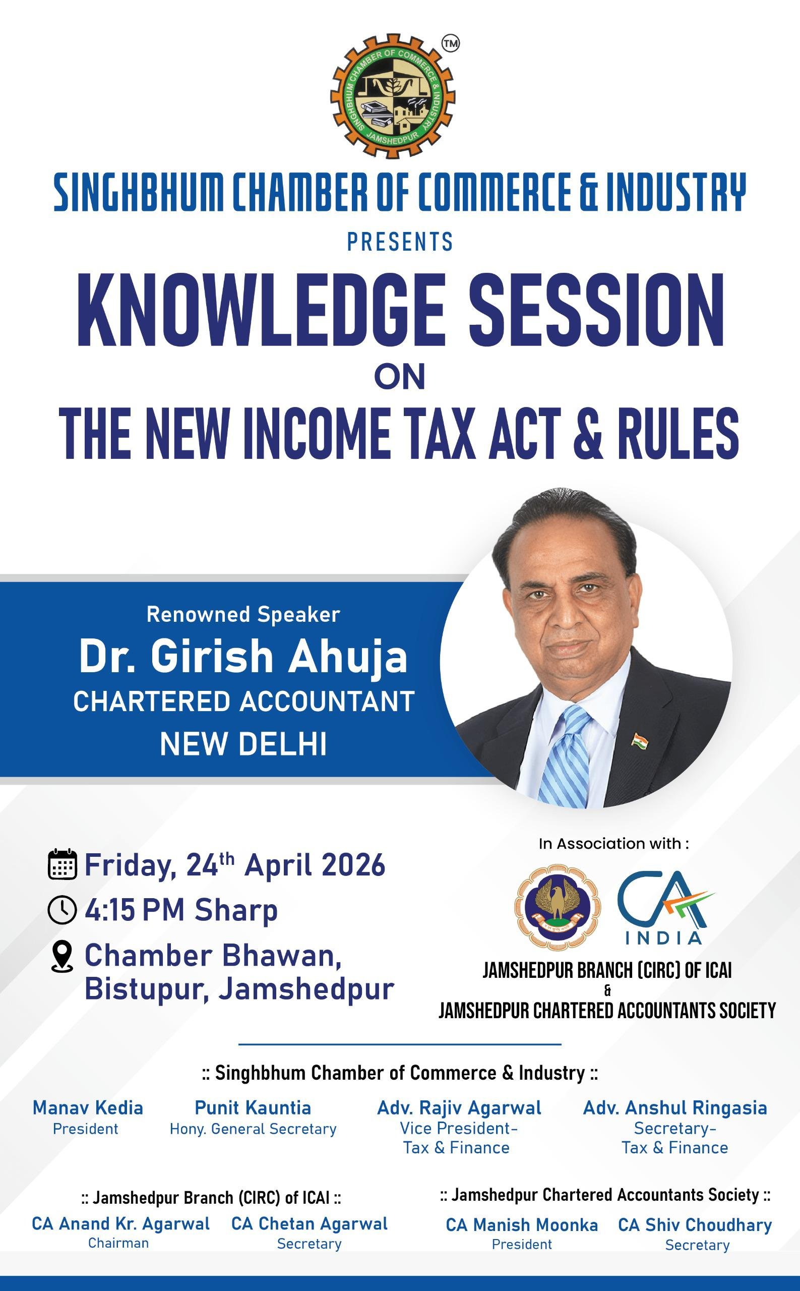 सिंहभूम चेंबर ऑफ कॉमर्स एंड इंडस्ट्री (SCCI) द्वारा दिनांक 24 अप्रैल 2026 (शुक्रवार) को चेंबर भवन, बिष्टुपुर, जमशेदपुर में “न्यू इनकम टैक्स एक्ट एवं नियमों” विषय पर एक महत्वपूर्ण ज्ञान सत्र (Knowledge Session) का आयोजन किया जा रहा है। कार्यक्रम का समय सायं 4:15 बजे (शार्प) निर्धारित किया गया है।