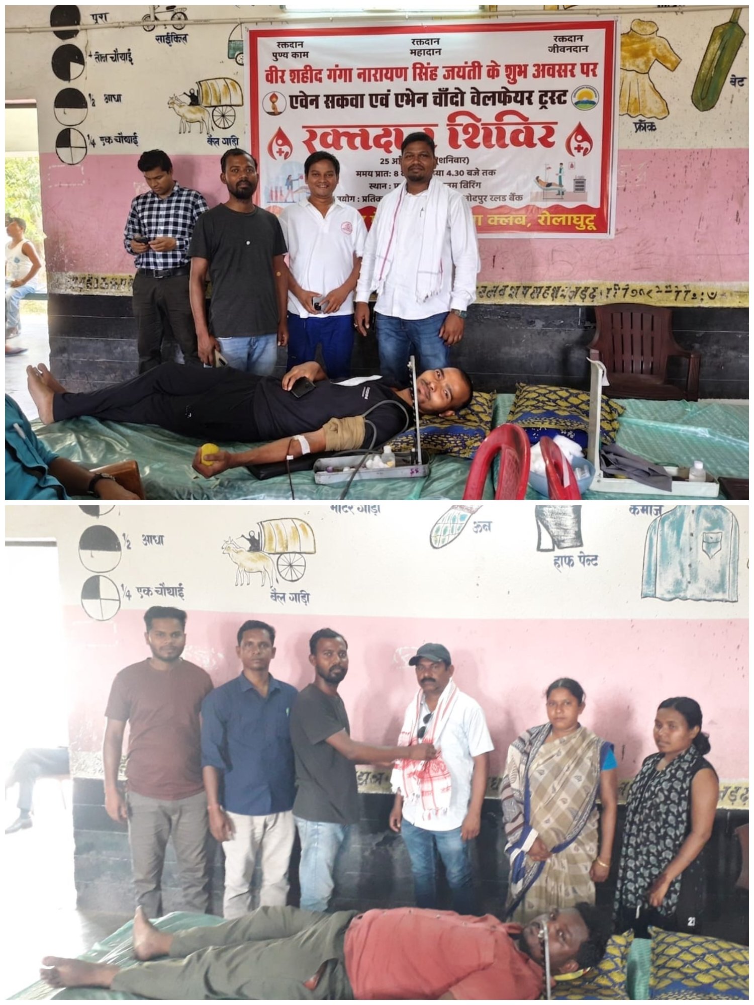 पोटका प्रखंड क्षेत्र के प्राथमिक विद्यालय तीरिंग में चुआड़ विद्रोह के महानायक वीर शहीद गंगा नारायण सिंह की 236 वीं जयंती के उपलक्ष पर रोलाघुटू गांव के अंग मेस्काल अहला क्लब,एवेन सकवा एवं एभेन चांदो वेलफेयर ट्रस्ट तथा प्रतीक संघर्ष फाउंडेशन एवं जमशेदपुर ब्लड बैंक के संयुक्त तत्वाधान में एक दिवसीय स्वैच्छिक रक्तदान शिविर का आयोजन किया गया। शिविर में इस चिलचिलाती तपती हुई धूप में युवाओं , महिलाओं ने बढ़ चढ़कर हिस्सा लिया। शिविर में मुख्य रूप से क्लब के अध्यक्ष जुड़ी पंचायत के मुखिया सुखलाल सरदार कोषाध्यक्ष सुशेन सरदार, तेंतला पंचायत के मुखिया अमृत माझी समेत अन्य उपस्थित रहे। पंचायत के मुखिया सुखलाल सरदार ने कहा कि रक्तदान सबसे बड़ा दान है इसकी कोई विकल्प नहीं है। उन्होंने कहा इस चिलचिलाती तपती हुई धूप में भी क्लब के युवा साथियों , महिलाओ के द्वारा रक्तदान कर एक जो मानवता का परिचय दिया गया है यह बहुत सराहनीय कार्य है। जिसके लिए उन्होंने युवा साथियों एवं महिलाओं को तेह दिल से धन्यवाद एवं आभार प्रकट किए। उन्होंने कहा कि इस तपती धूप में भी अस्पताल में इलाज इलाज रथ लोगों को ब्लड का कमी ना हो, जिसके लिए प्रत्येक वर्ष की भांति इस वर्ष भी बीर शहीद गंगा नारायण सिंह जयंती के उपलक्ष पर क्लब के द्वारा एक दिवसीय स्वैच्छिक रक्तदान शिविर का आयोजन किया गया है। प्रतीक शंकर फाउंडेशन के निर्देशक अरिजीत सरकार ने कहा कि रक्तदान, महादान है, ईस भीषण गर्मी मे क्लब के द्वारा रक्तदान शिविर का आयोजन करना वास्तव में सराहनीय कार्य है ।इस मौके पर क्लब के अध्यक्ष सह मुखिया सुखलाल सरदार, तेंतला पंचायत मुखिया अमृत माझी, साहित्यकार सुनील कुमार दे, शंकर चंद्र गोप, राजकुमार साहू, कार्तिक मुंडा, लख्खी पद दास, सुशांत सरदार, मानिक सरदार, विश्वजीत सरदार, हुसैन सरदार ,पिंटू सरदार, आदि के साथ प्रतीक शंकर फाउंडेशन के पूरे टीम उपस्थित रहे।